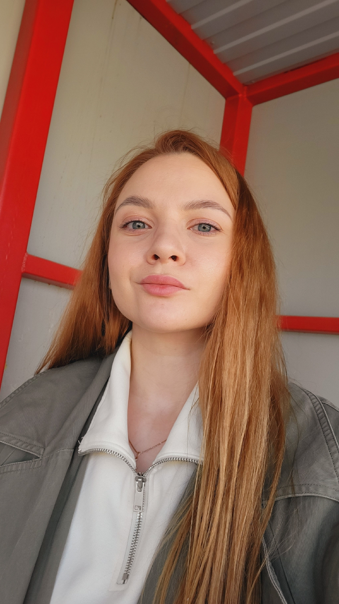 A woman with long, red hair is photographed from below. She is wearing a white shirt and a green jacket. Behind her is a red metal structure. The location is indicated as Chaikovsky, Russia, but no el…read more