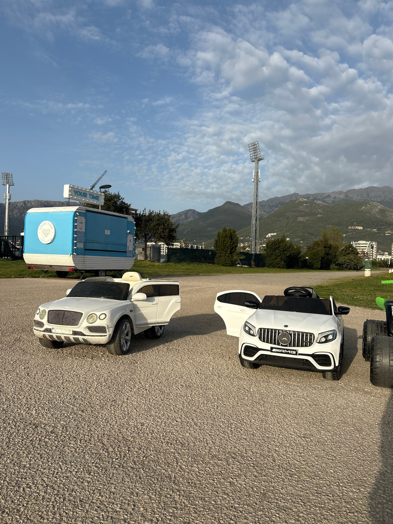 The image shows a paved area, possibly a parking lot or road, with two toy cars – a white Mercedes-AMG and a white Bentley – and a blue and white trailer labeled "YOUR TIME". Behind the vehicles, ther…read more