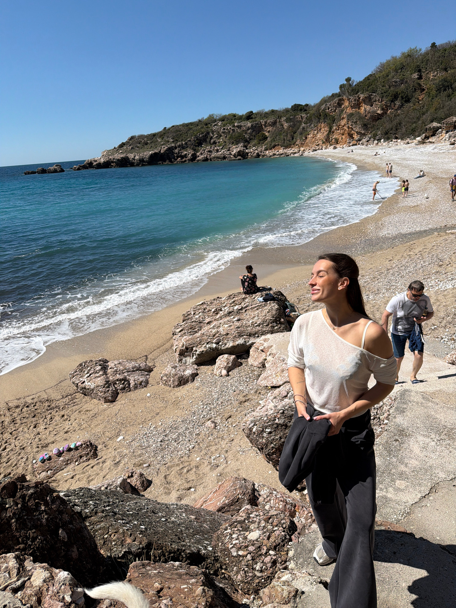 A woman in a white shirt and black pants stands on a rocky cliff overlooking a beach in Drobnići, Montenegro. The beach has light-colored sand and clear turquoise water. Other people are seen on the b…read more