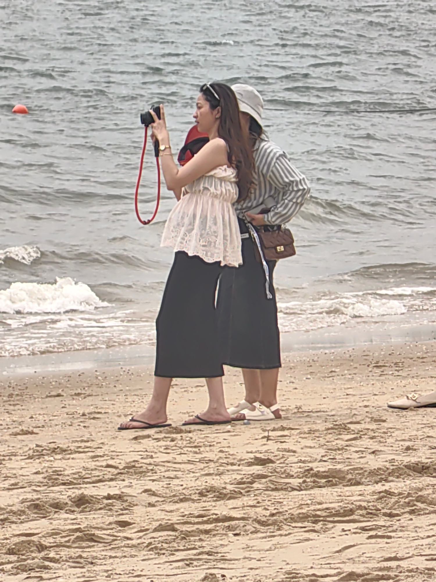 On a sandy beach in Bai Chay Ward, Vietnam, a woman stands taking a photograph with a camera that has a red strap. She wears a white, lacy top and long, dark-colored pants, and flip-flops. Another per…read more