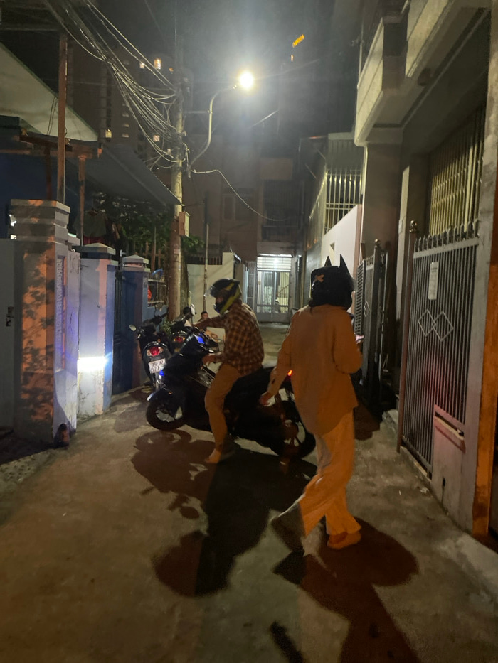 The image captures a nighttime scene within a narrow residential alleyway in Nha Trang, Khanh Hoa province, Vietnam. The paved concrete surface is illuminated by a single overhead street lamp mounted…read more