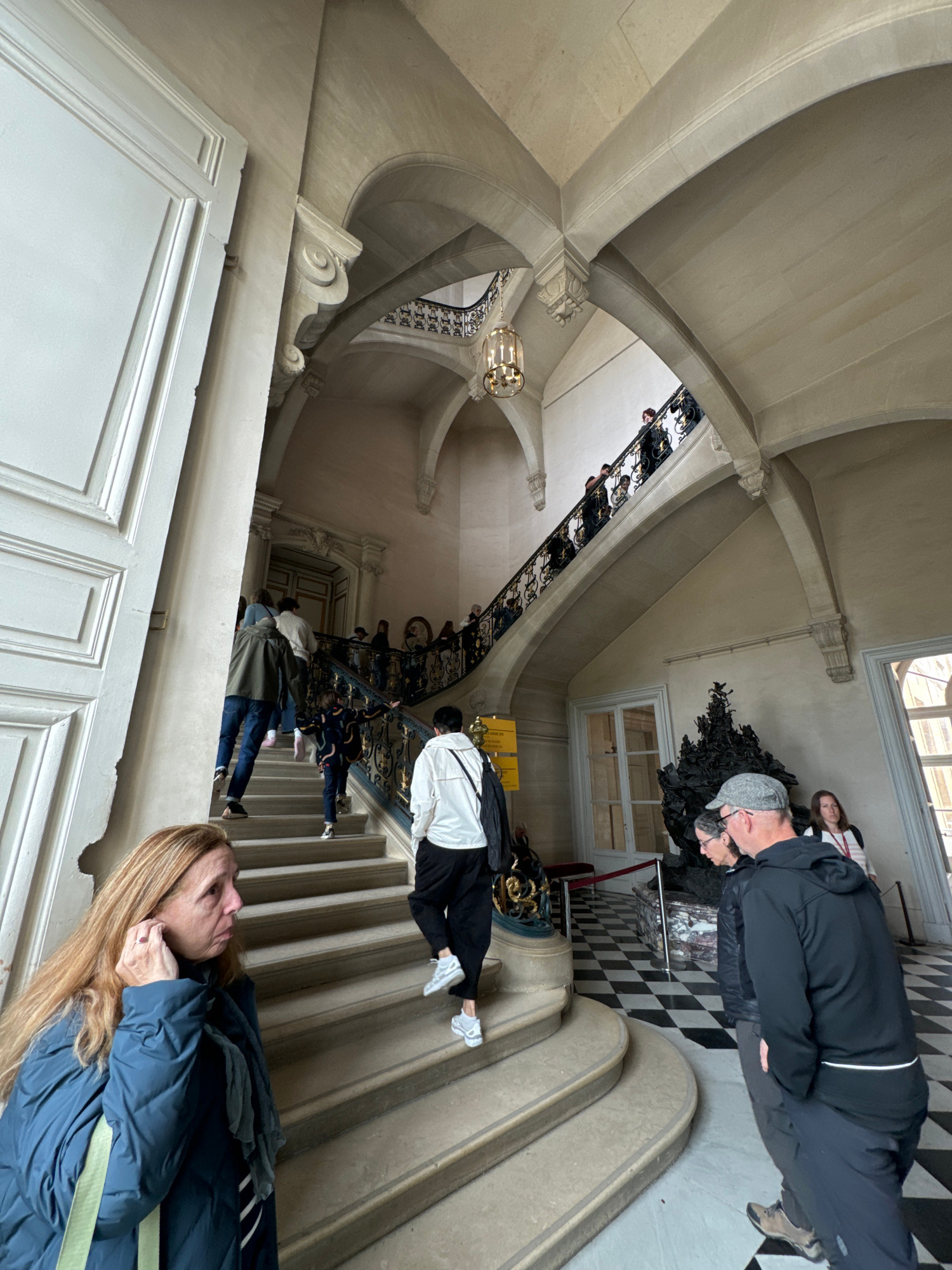The image depicts a view inside what appears to be a portion of a grand staircase at the Palace of Versailles, France. The camera is angled upwards, capturing the ornate architecture, which features s…read more
