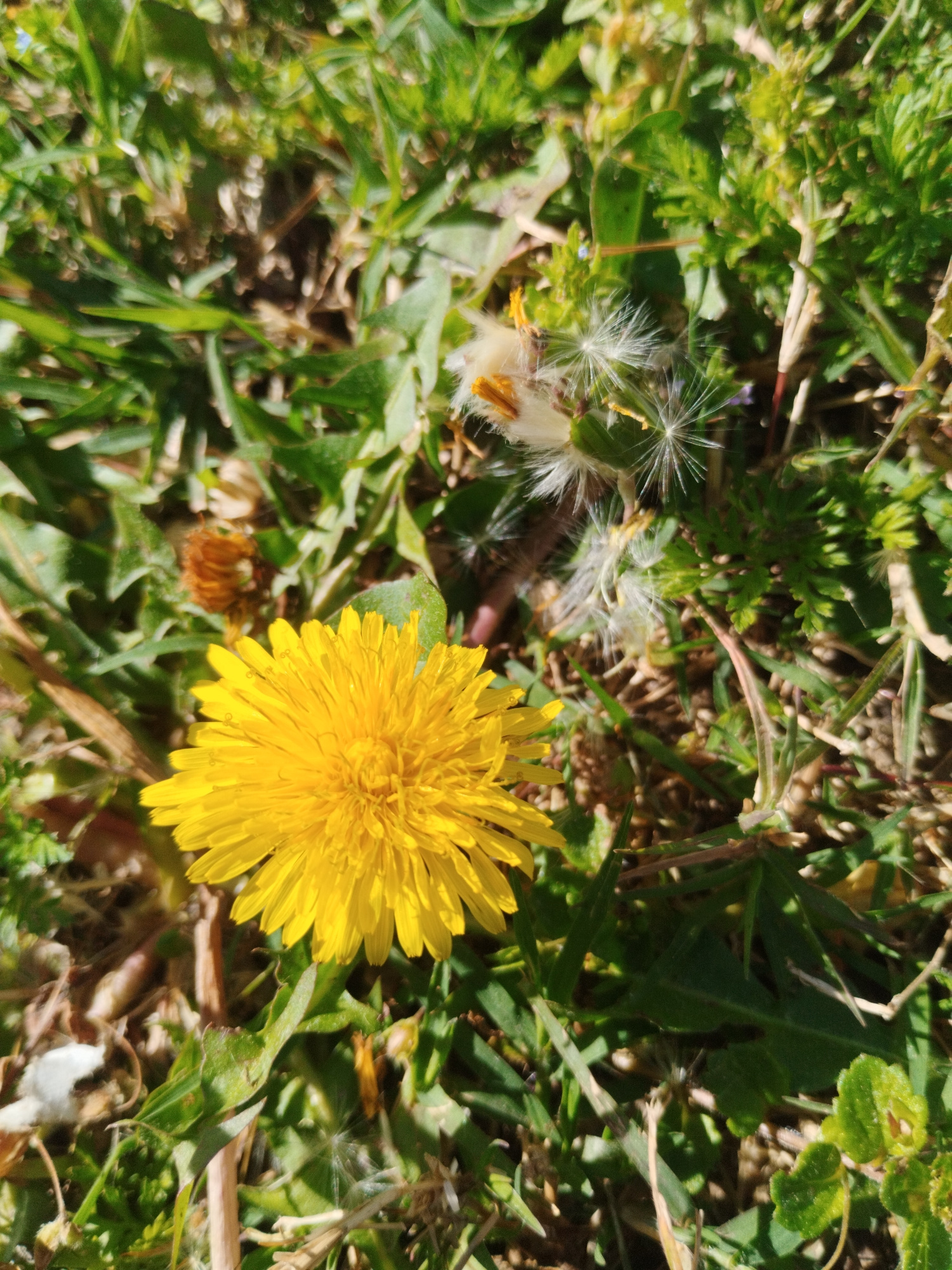 A close-up, outdoor shot captures a vibrant natural scene dominated by dandelions. In the foreground and slightly to the left, a single, bright yellow dandelion flower is in full bloom, its numerous p…read more