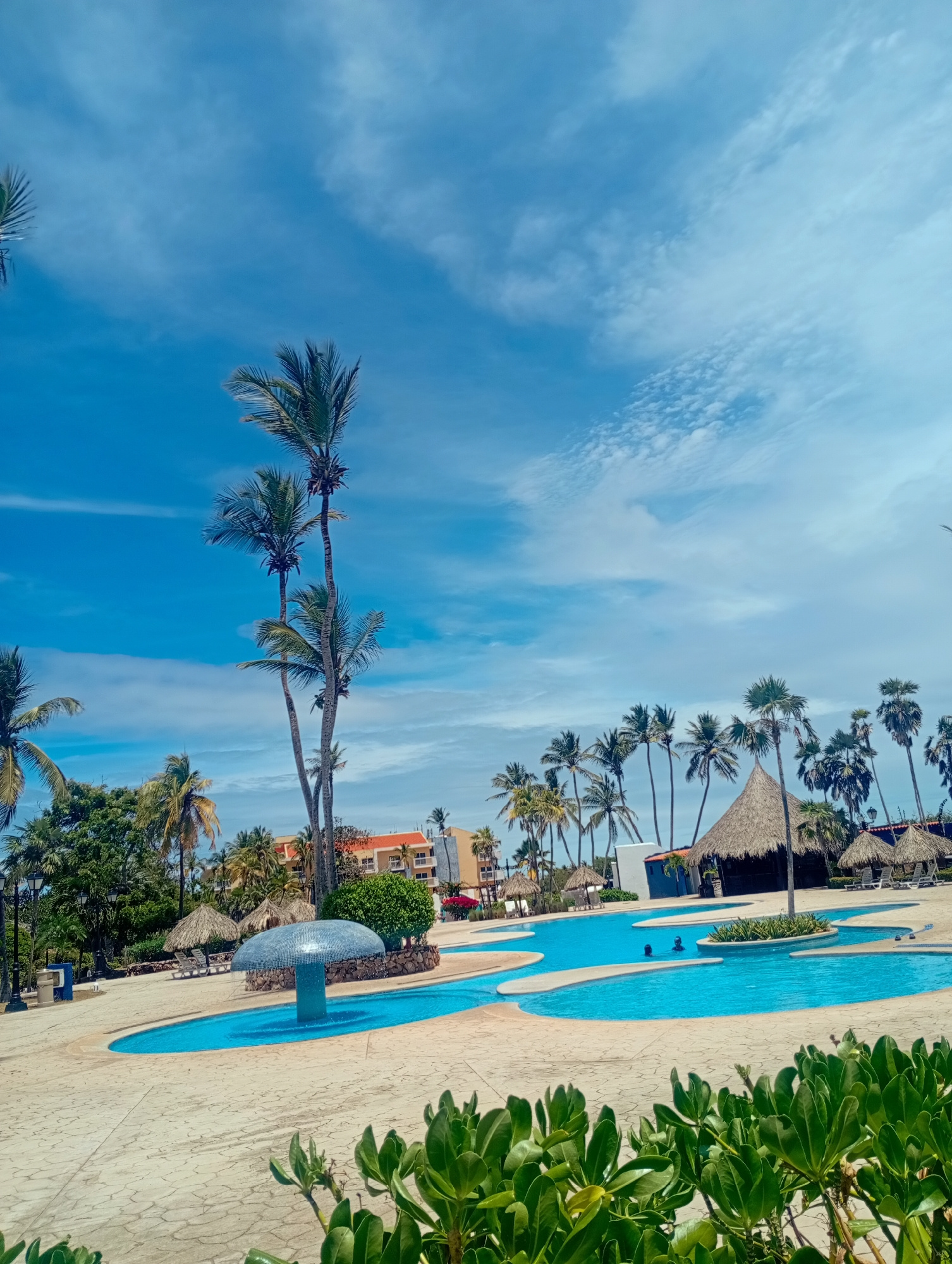 The image depicts a resort swimming pool in Playa El Agua, Venezuela. The pool is irregularly shaped and filled with blue water. Several palm trees surround the pool area, with some having thatched-ro…read more