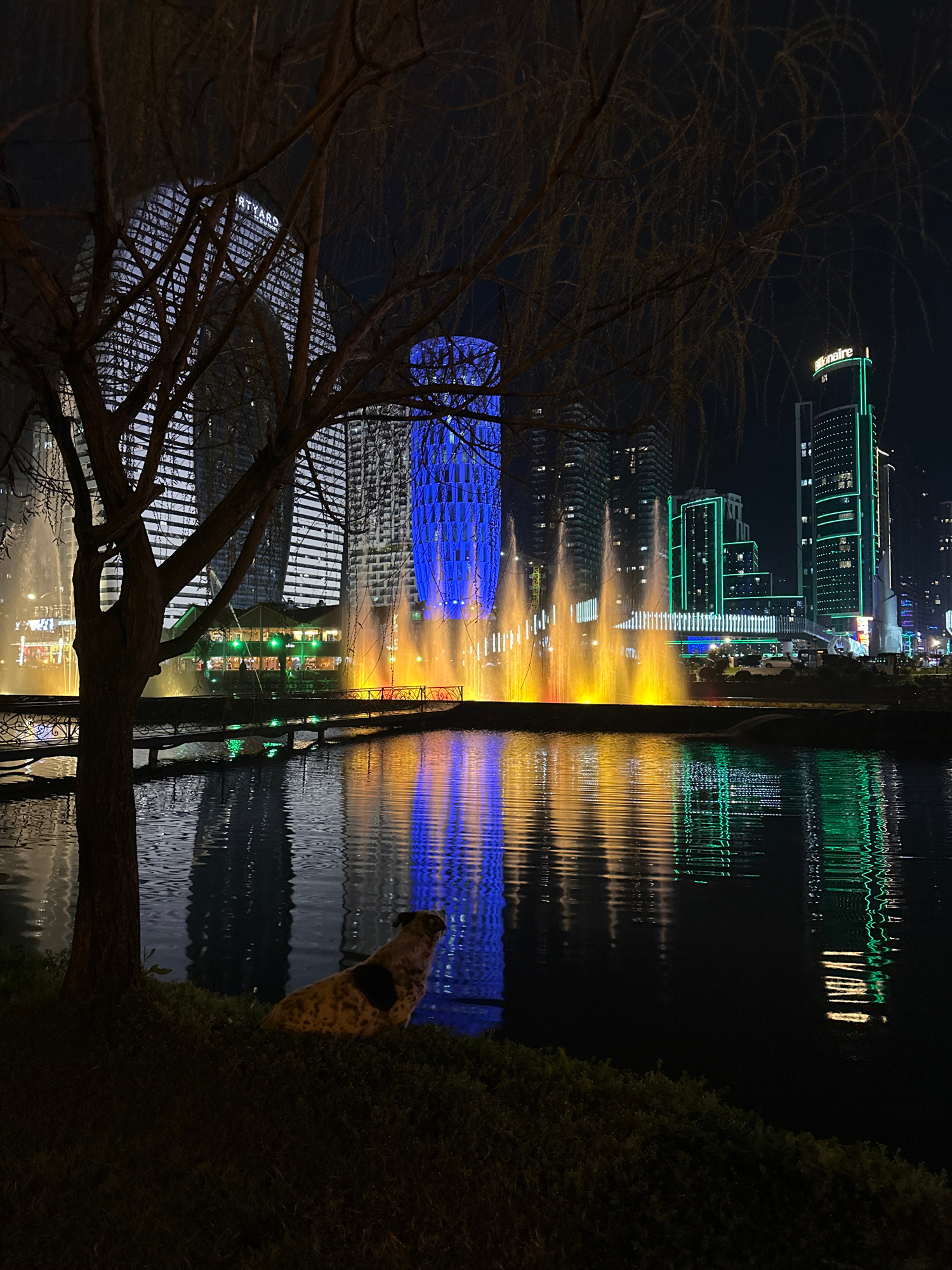 The image shows a night scene in Batumi, Georgia, featuring illuminated buildings and water features reflected in a body of water. A bare tree is in the lower left of the frame. Modern, high-rise buil…read more