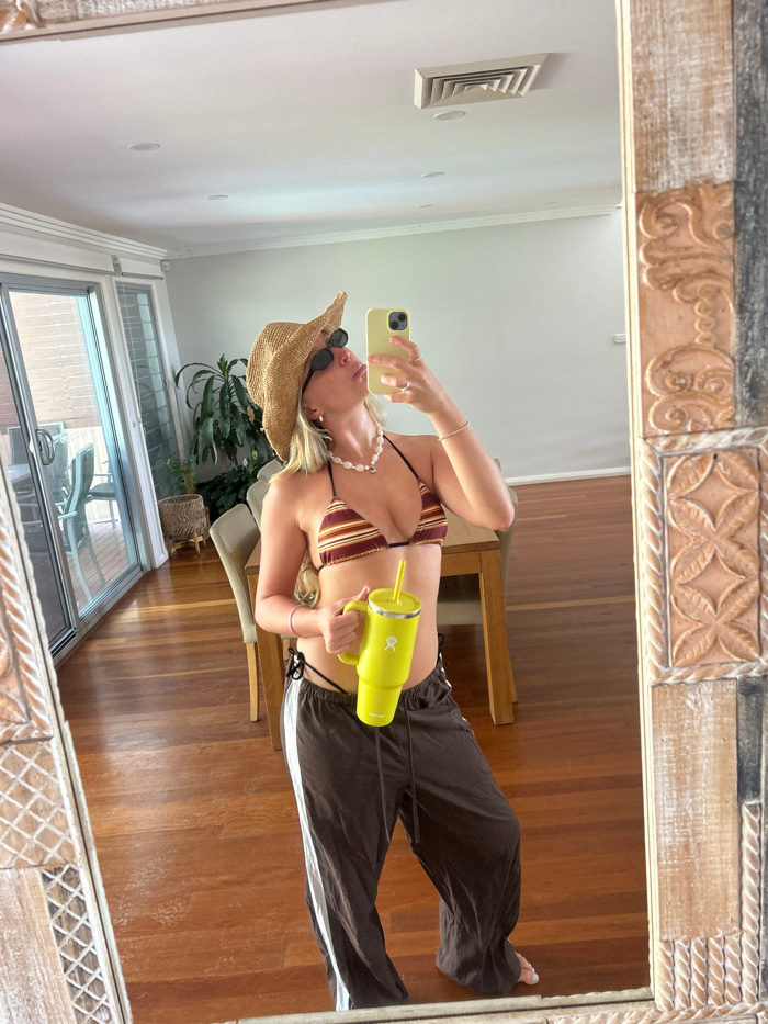 A blonde woman, reflected in a rustic-framed mirror, holds a yellow phone in one hand and a matching yellow water bottle in the other. She wears a striped bikini top, dark, loose-fitting pants with a…read more