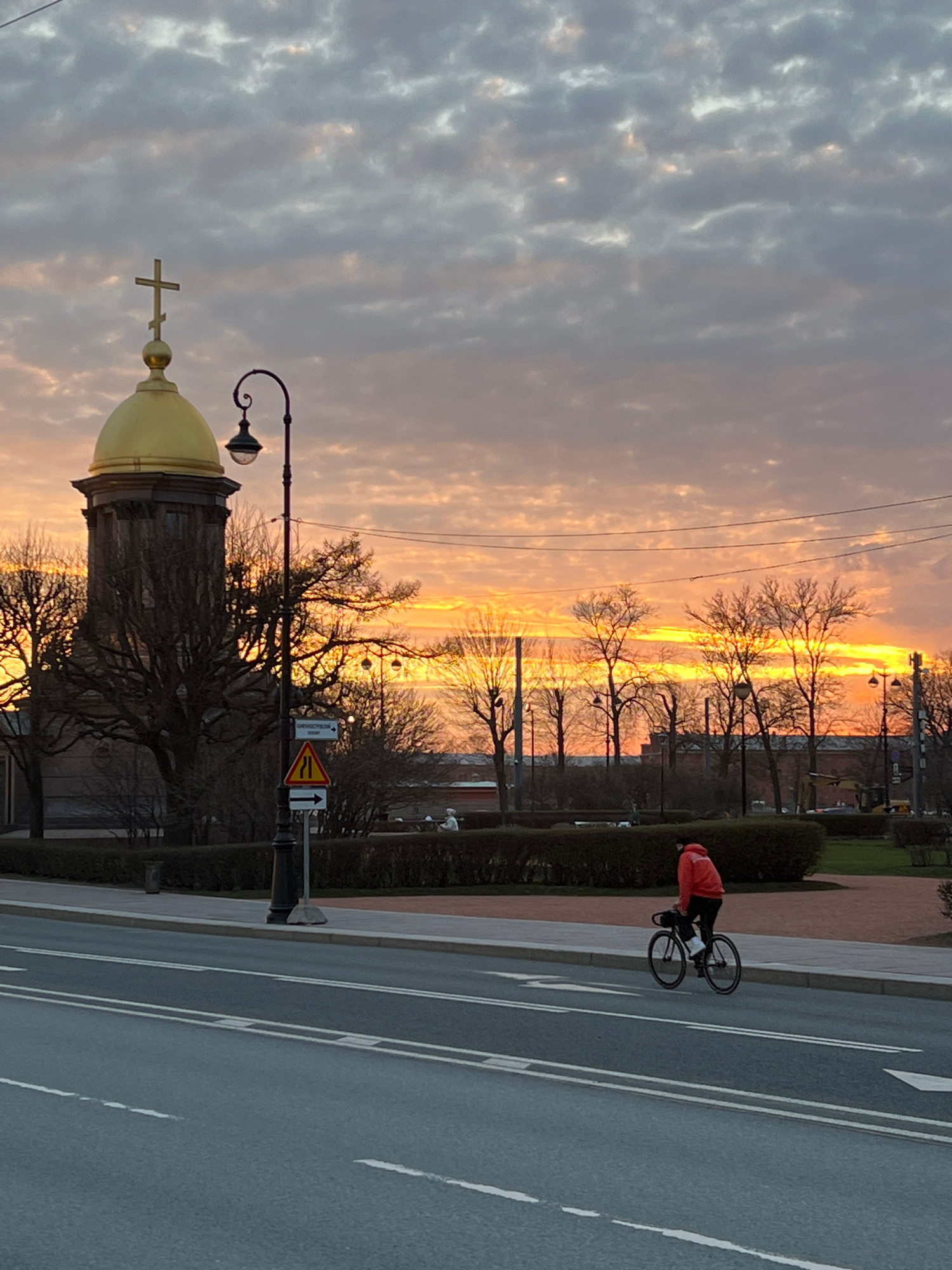 The image shows a sunset scene in Saint Petersburg, Russia, with a view of the Smolny Cathedral's golden dome in the foreground. The sky is filled with clouds reflecting the colors of the sunset, primβ¦read more