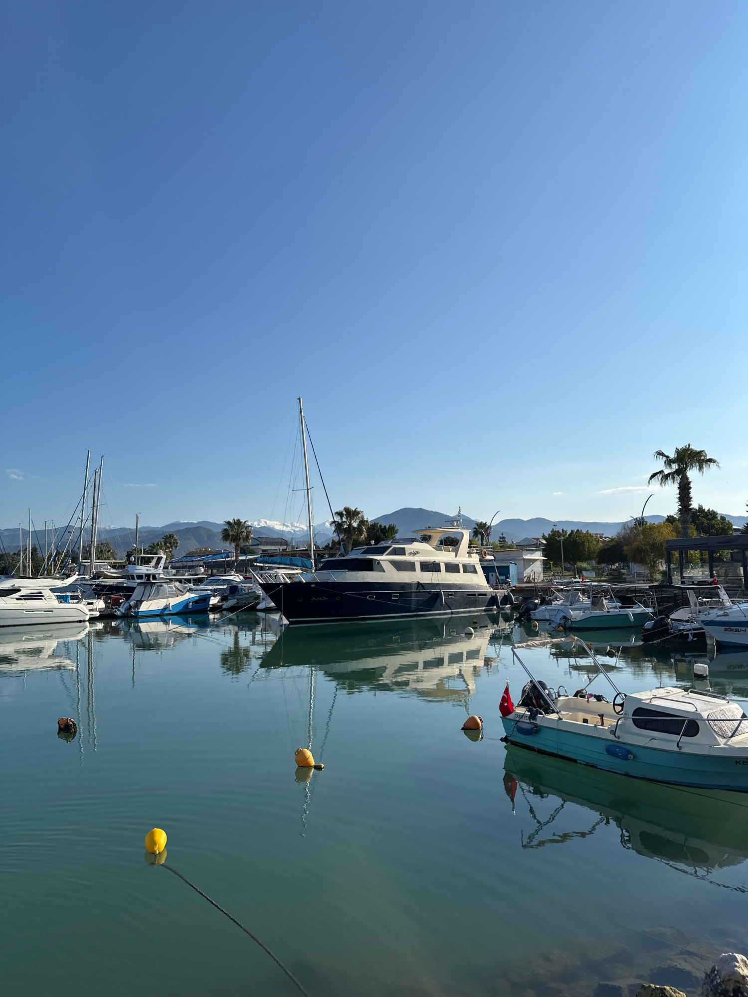 The image depicts a marina in Fethiye, Turkey. Several boats of varying sizes are docked along a pier, their reflections visible in the calm water. Mountains are seen in the background, with palm tree…read more