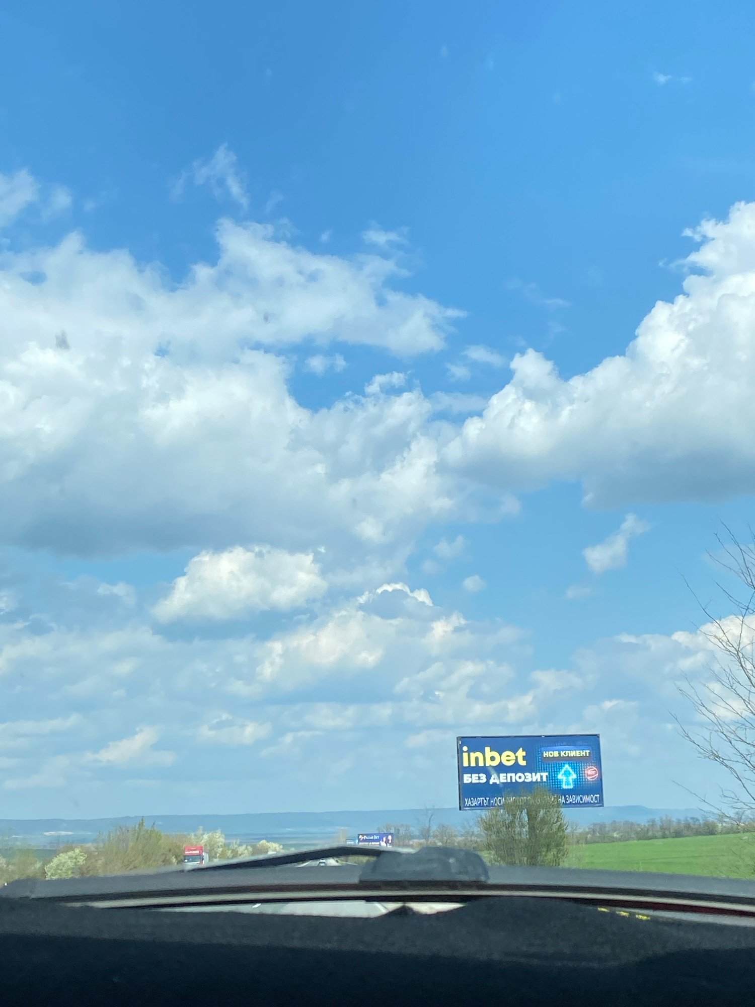 The image appears to be taken from inside a moving vehicle, looking out at a billboard on the side of the road. The sky occupies a large portion of the frame, filled with white clouds against a blue b…read more