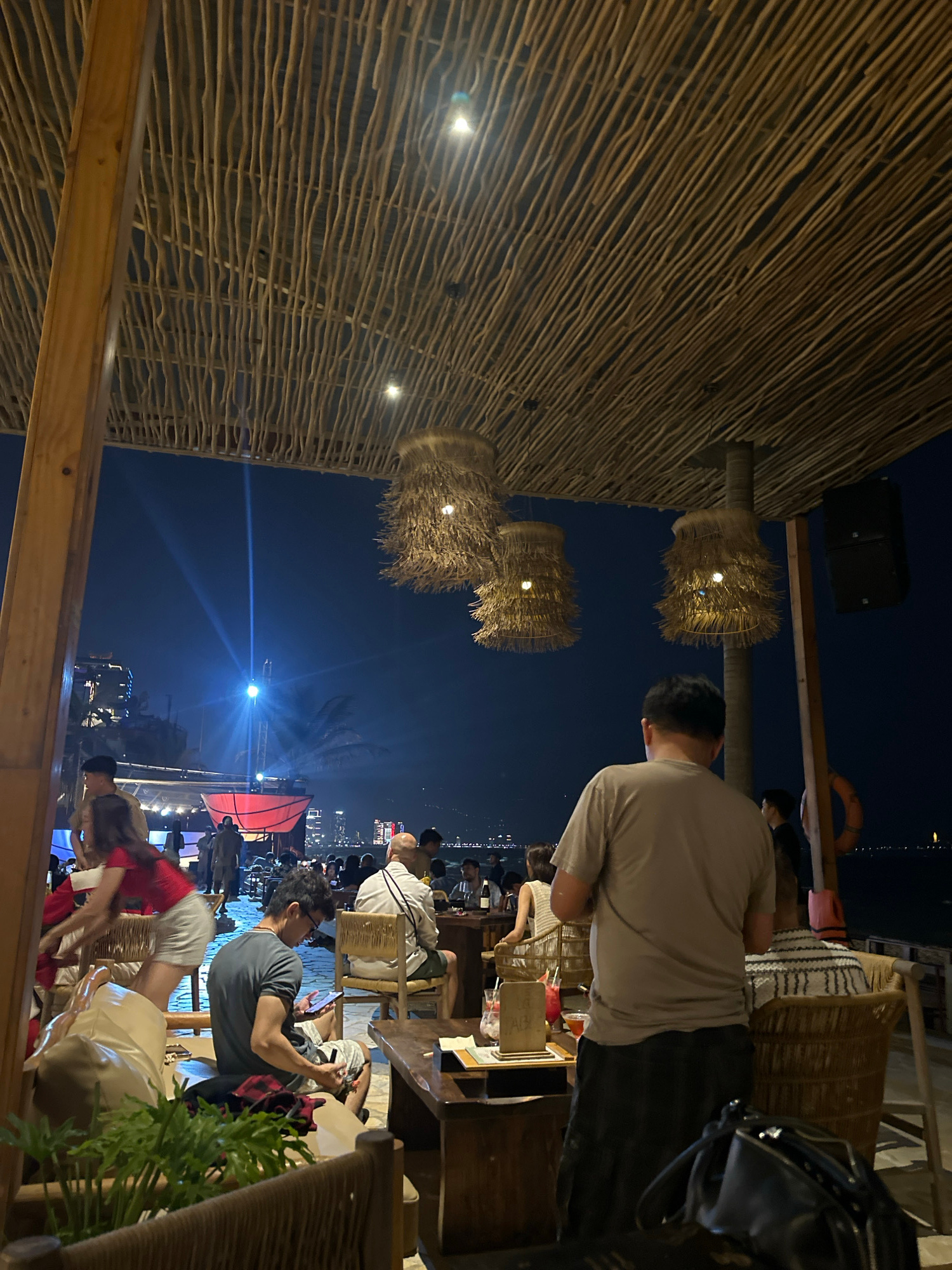The image depicts an outdoor seating area at a restaurant or bar in Đà Nẵng, Vietnam at night. The seating area is covered by a thatched roof. Several people are seated at tables, some appearing to be…read more