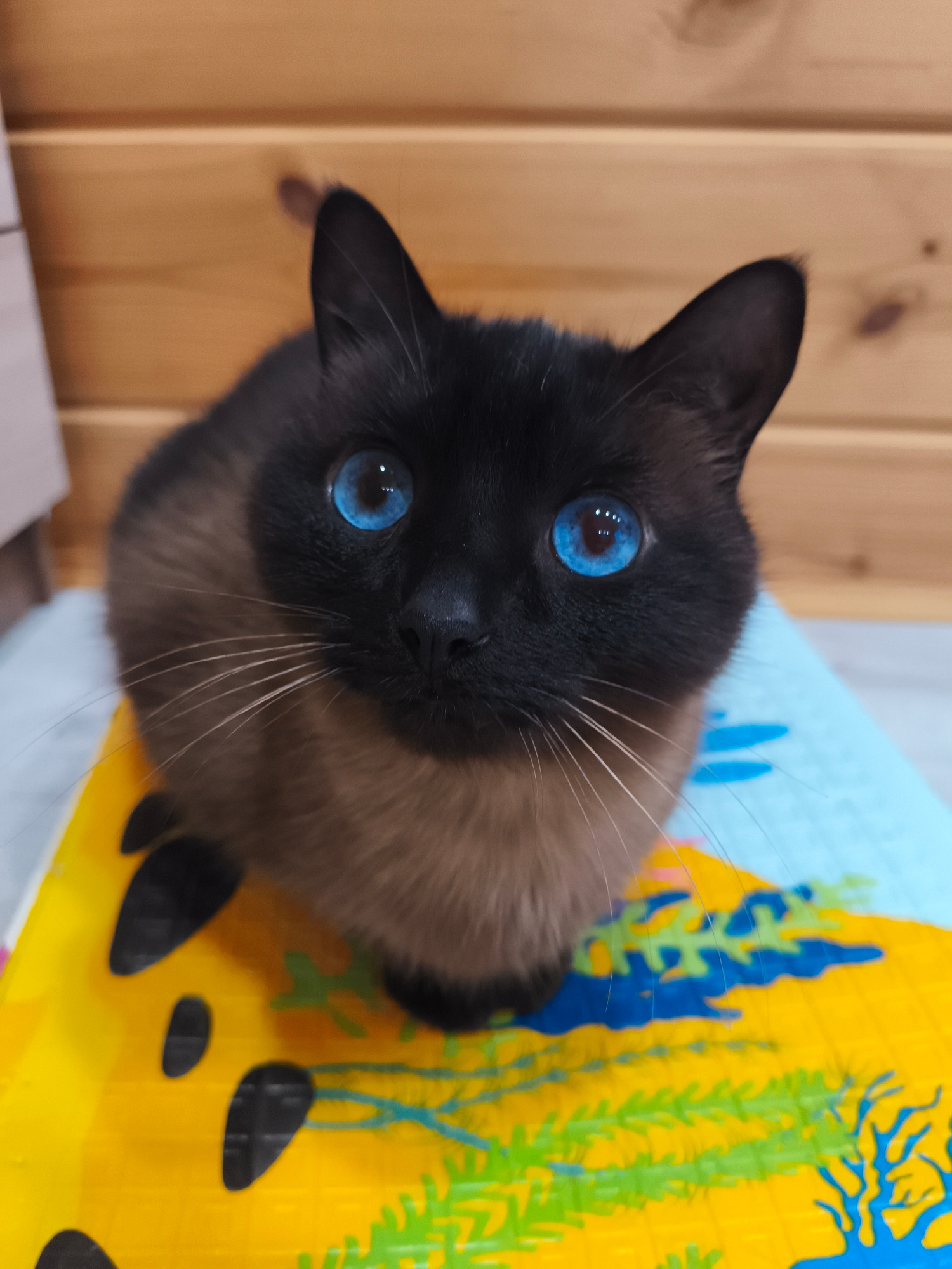 A close-up shot shows a Siamese cat perched on a colorful, patterned surface. The cat's fur is dark brown on its face, ears, and parts of its body, with lighter tan fur on its chest and shoulders. Its…read more