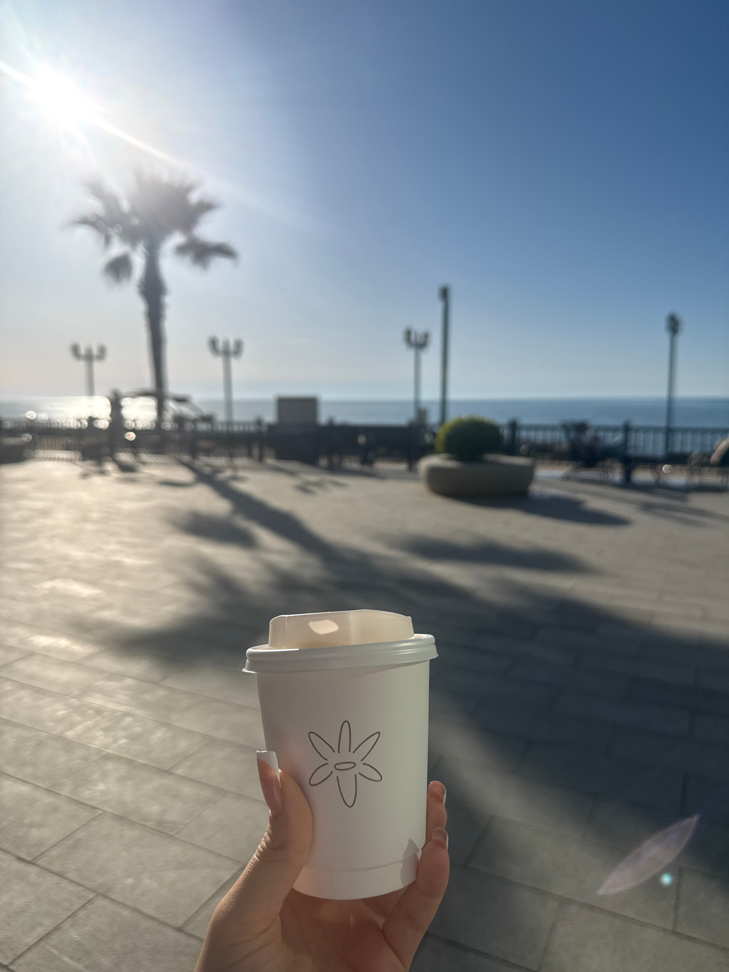 This bright, sun-drenched image, likely taken in Batumi, Georgia, captures a person's hand holding a white disposable cup against an outdoor coastal backdrop. The hand, with neatly manicured light-col…read more