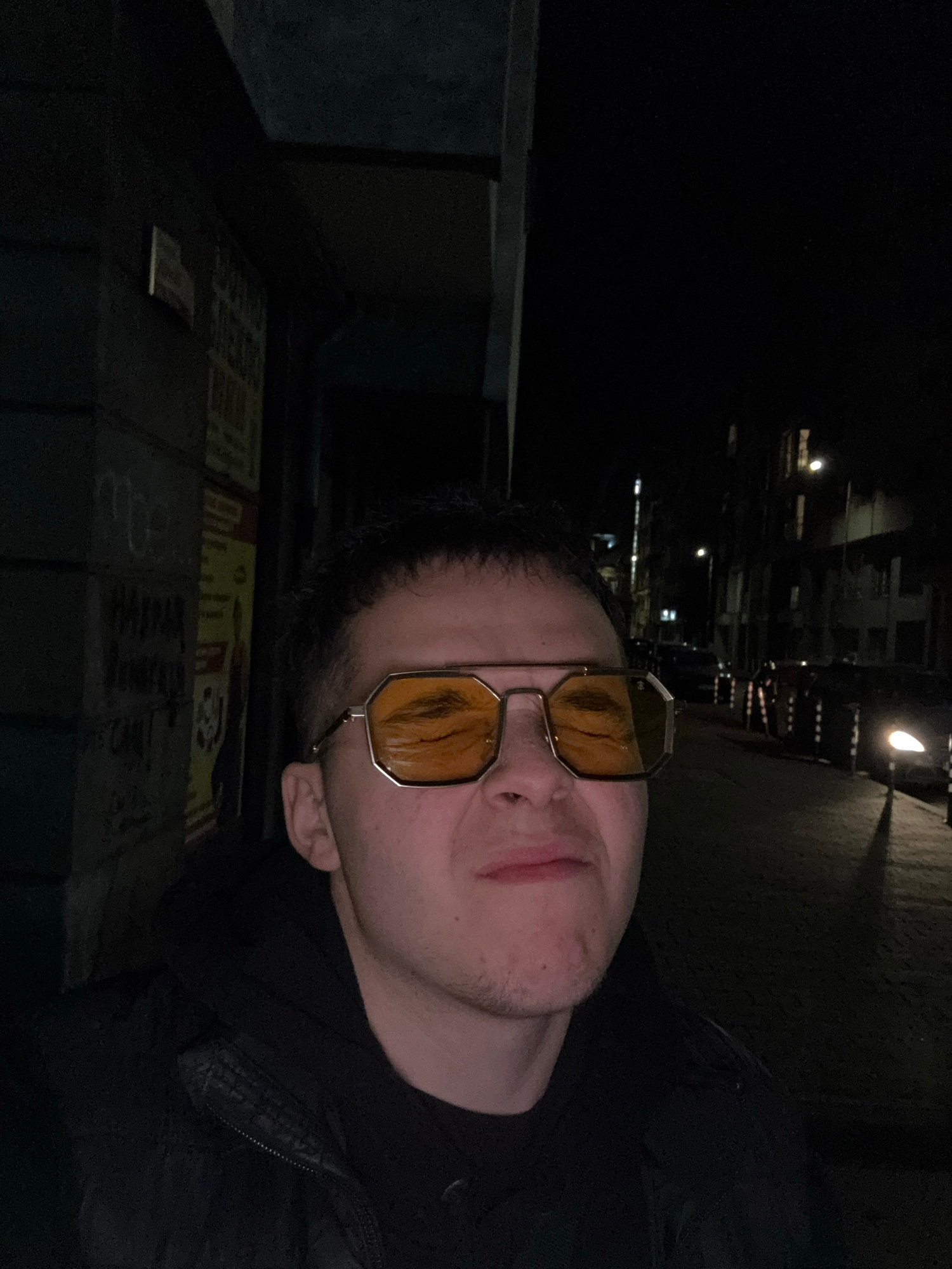 A nighttime close-up portrait of a person wearing yellow tinted glasses. The background shows buildings and streetlights in the city. The person is wearing a dark jacket. There are posters on a wall v…read more