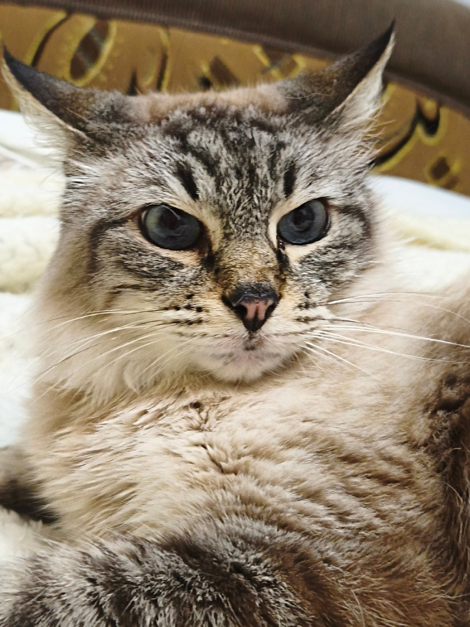 A close-up photograph shows the face and upper body of a lynx point Siamese cat. The cat has blue eyes, a pink nose, and dark gray markings on its head and ears. Its fur is predominantly beige and gra…read more