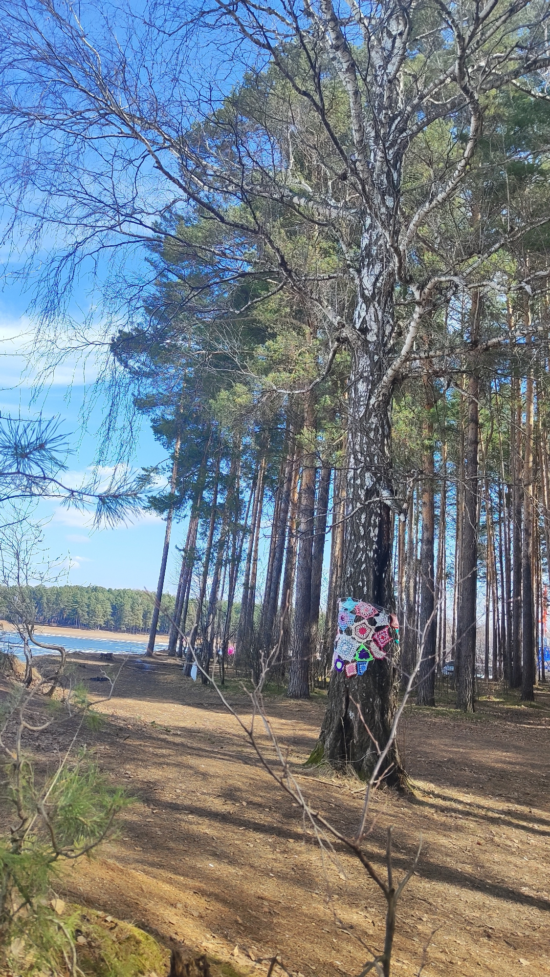 This vertical image depicts a serene forest scene at the edge of a body of water, likely a lake or river, under a bright, clear blue sky. The setting appears to be Chaikovsky, Russia, characterized by…read more