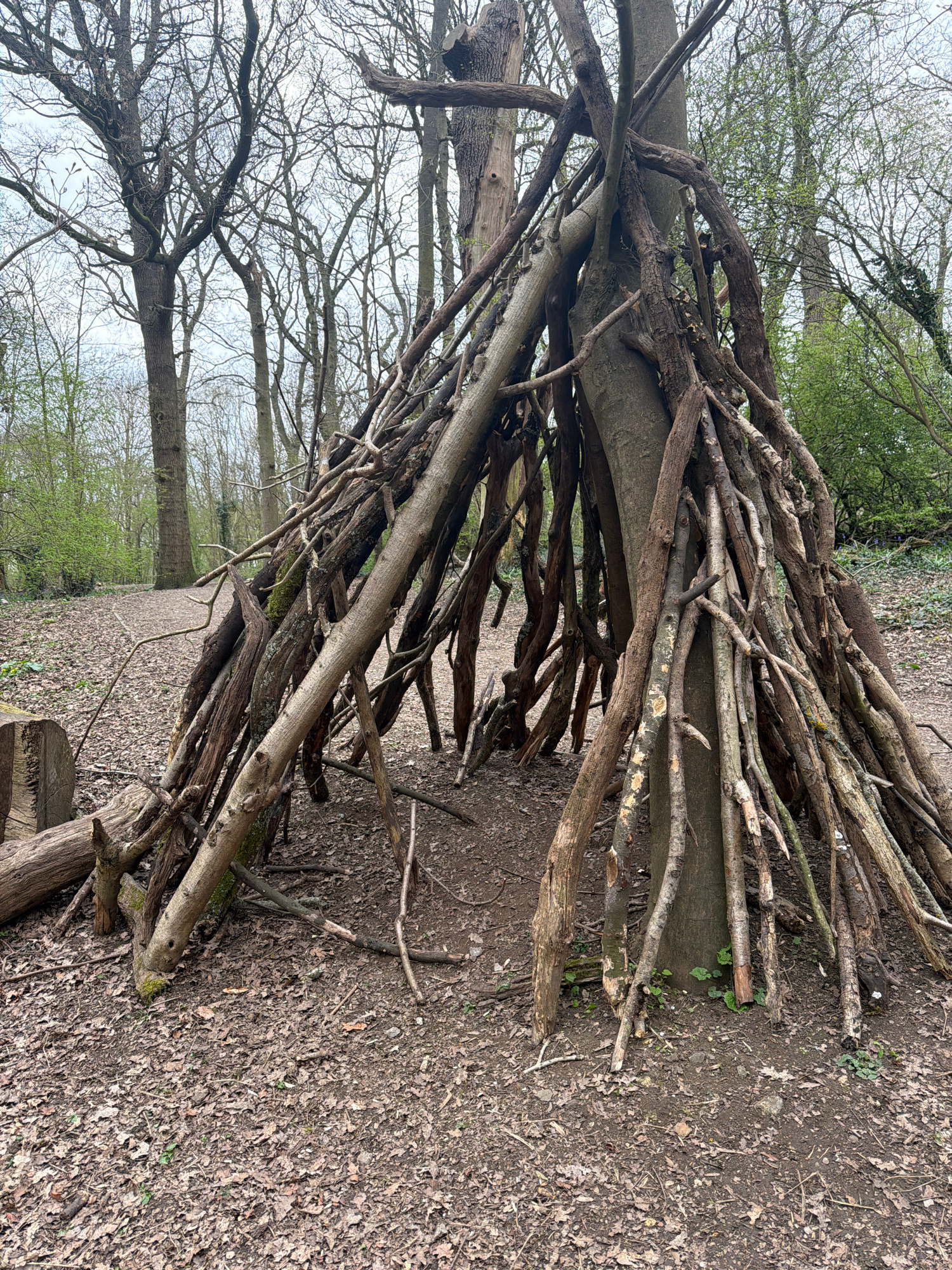 The image shows a shelter constructed from branches in a woodland setting, likely located in Maidstone, United Kingdom. The shelter is leaning against a fallen tree trunk and is made of various sized…read more
