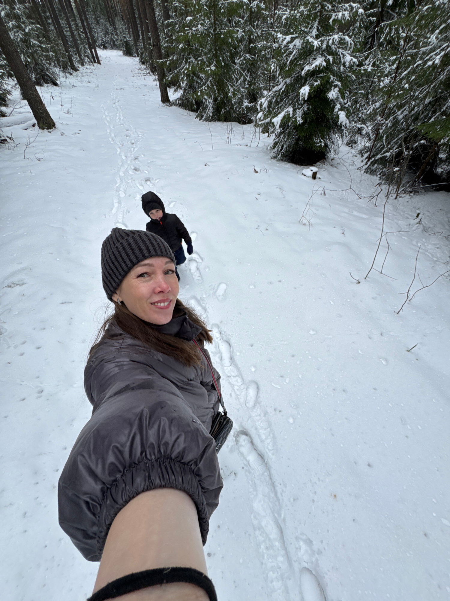 A selfie photograph depicts a woman and child in a snowy environment. The woman, wearing a gray puffer jacket and a gray striped beanie, smiles towards the camera. A child, dressed in dark clothing, sā¦read more