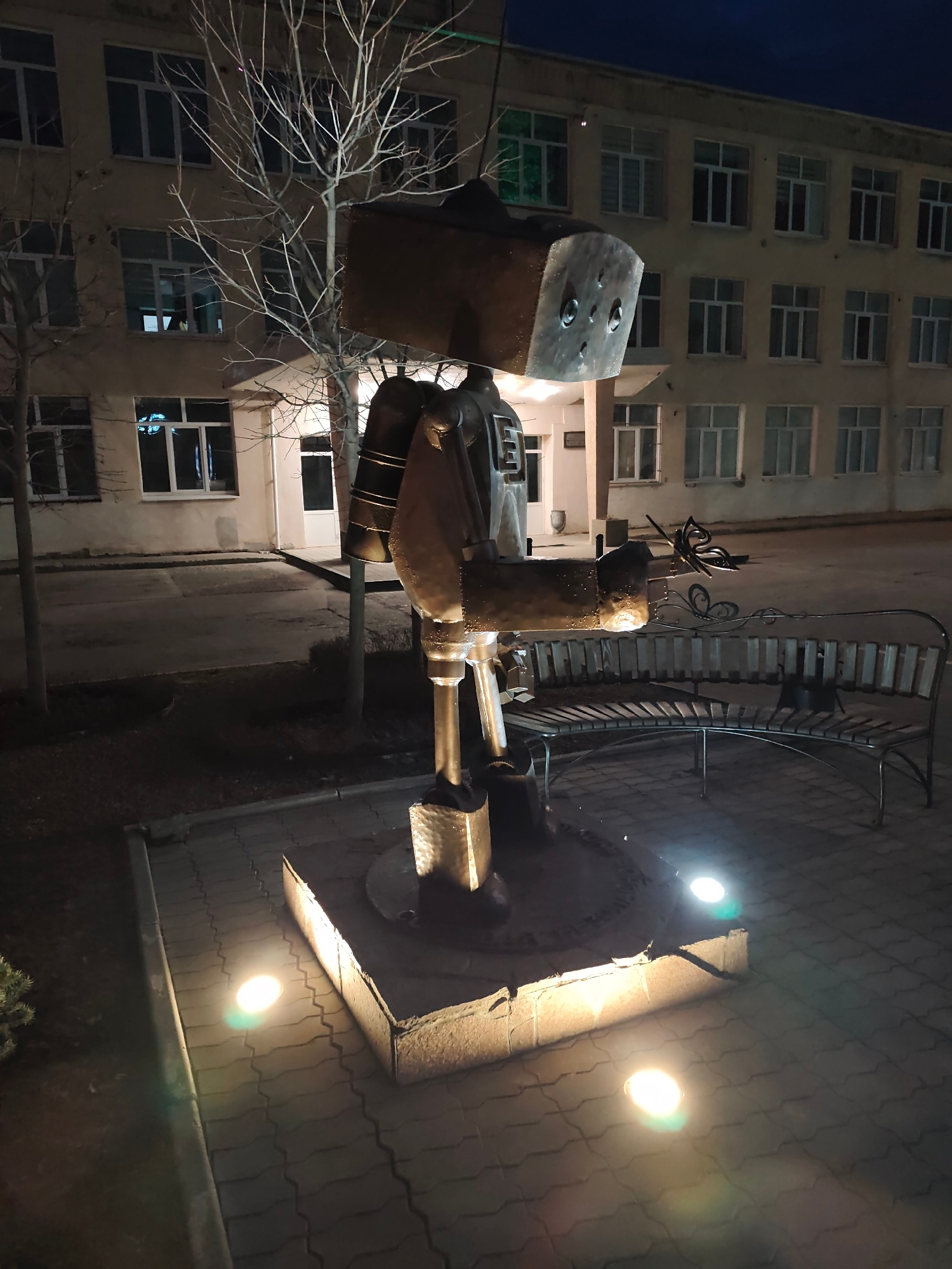 The media file captures an outdoor scene at night in Chaikovsky, Russia, dominated by a distinctive metal sculpture. The central subject is a large, stylized figure, possibly a robot or character, cra…read more
