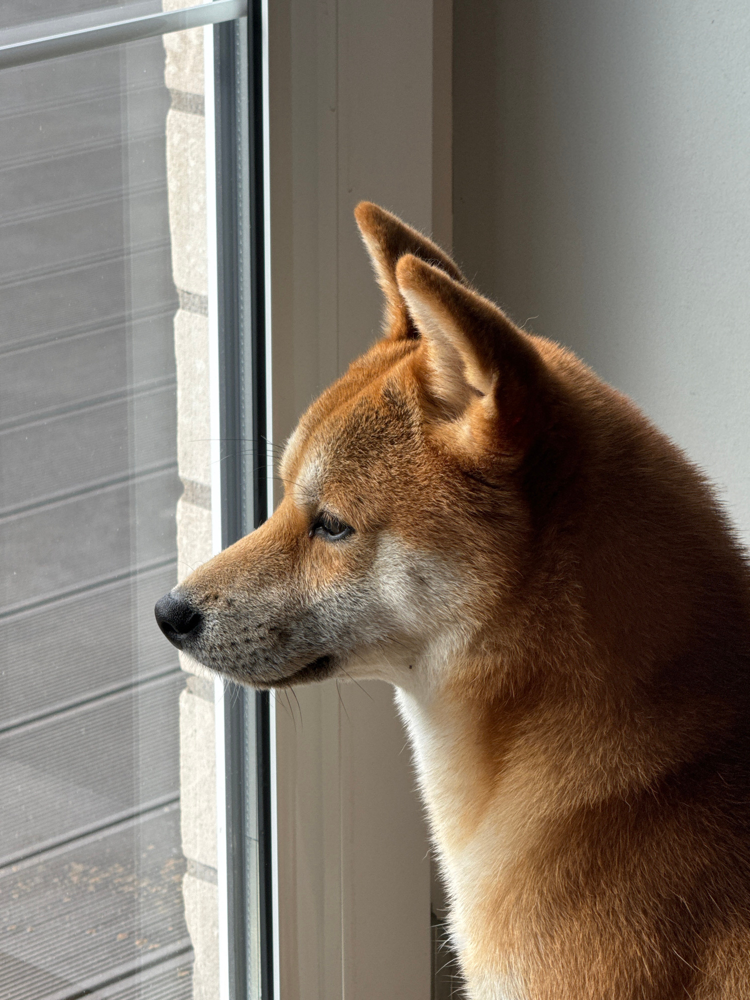 The image shows a Shiba Inu dog looking down through a window. The dog has a brown and white coat. The window has a white frame and a grey screen. Outside the window is a grey deck or patio. The locat…read more
