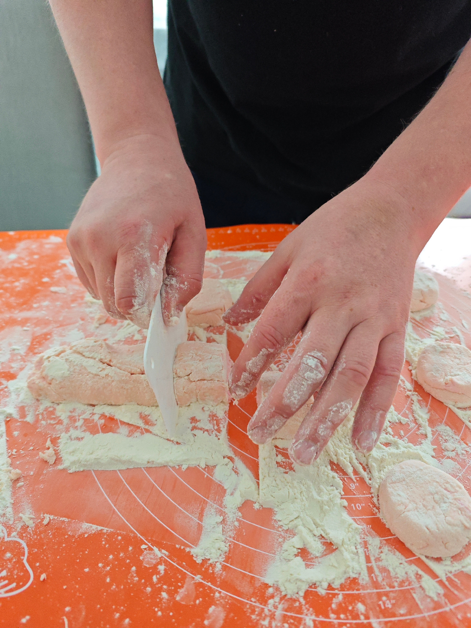A person wearing a black shirt is cutting dough with a white plastic scraper on an orange silicone baking mat covered in white flour. The person's hands are also covered in flour. The mat has white me…read more