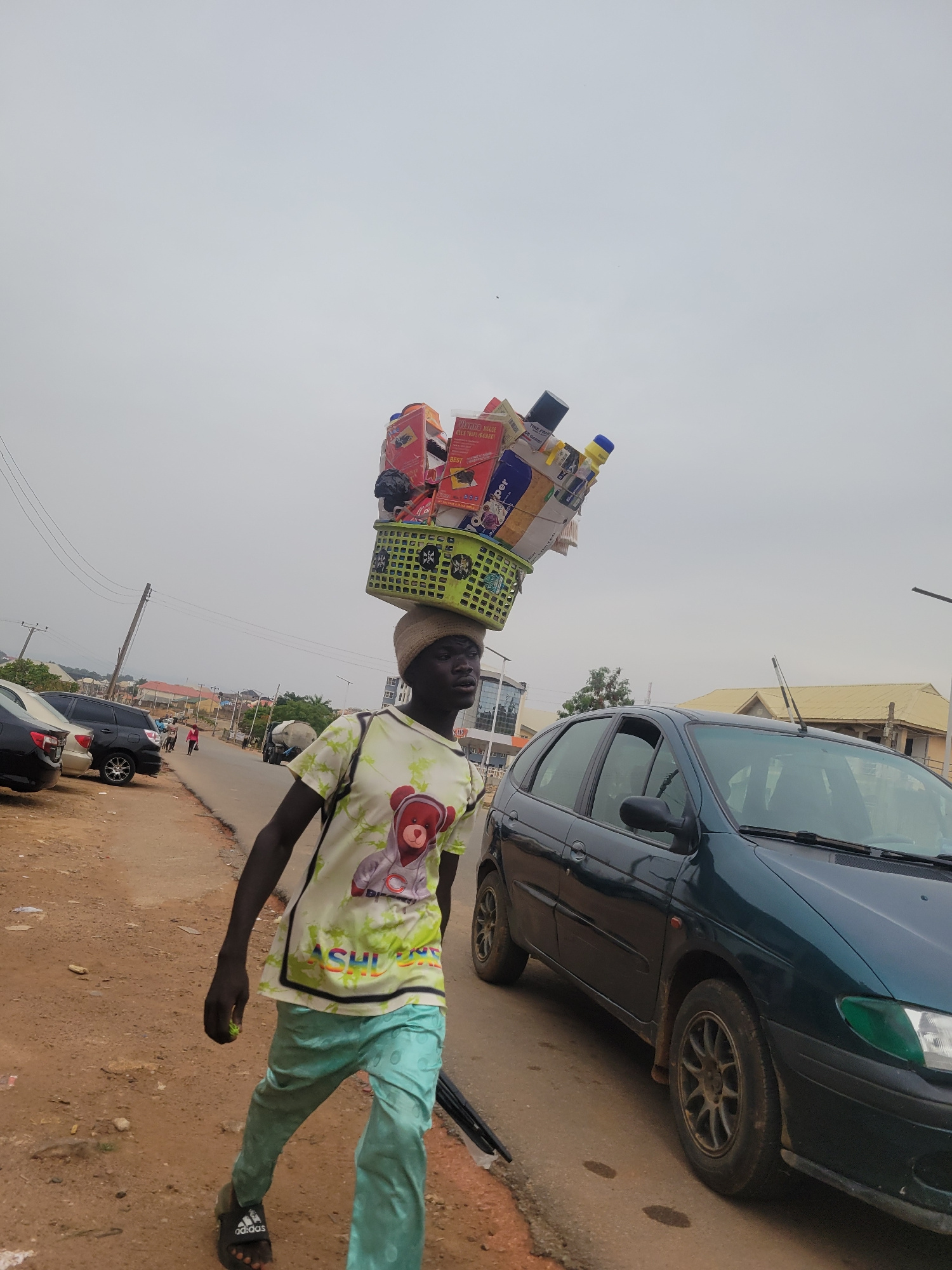 The image displays a street scene in what appears to be a town or city, likely in Jos, Nigeria. A young Black male, positioned centrally, is depicted standing or walking along the side of a road. He iā¦read more