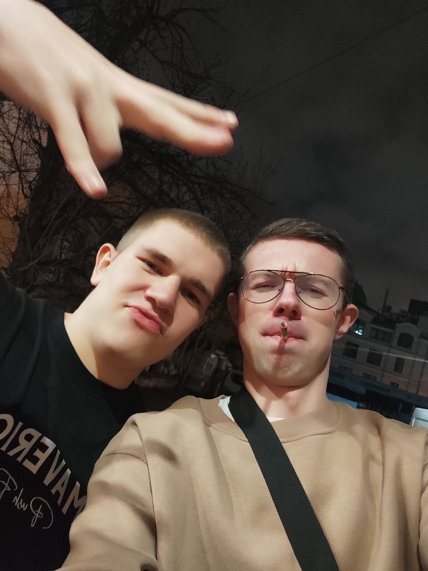 Two fair-skinned young men are closely positioned in the frame, with a partial hand appearing above them, fingers splayed, possibly indicative of a gesture. The man in the lower portion of the frame w…read more