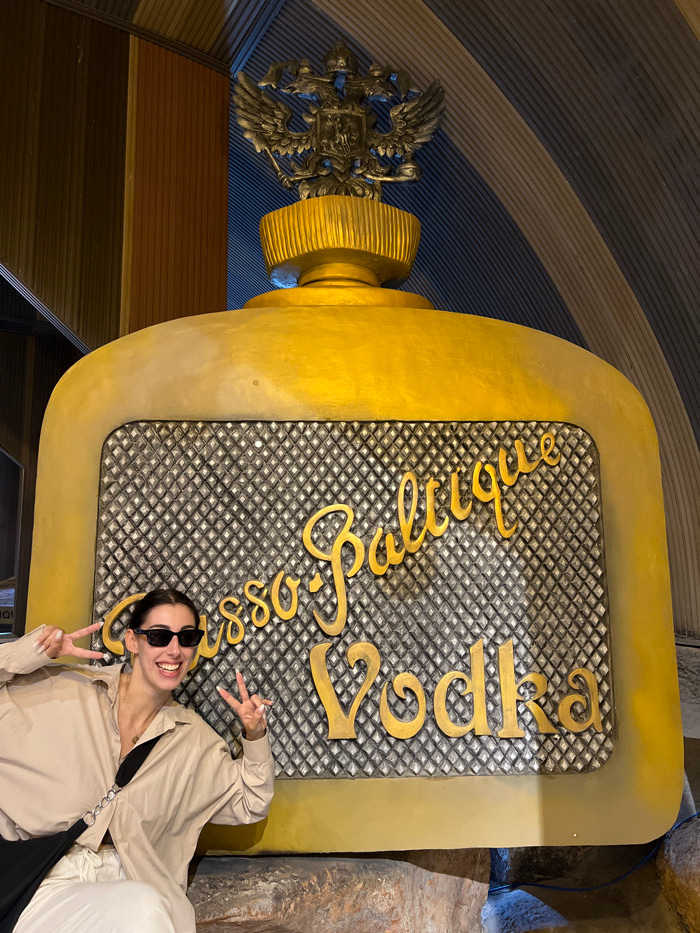A woman with sunglasses poses with two peace signs next to a large, golden vodka bottle-shaped sign that reads "Beluga Vodka." The sign is textured with a diamond pattern on its surface. The bottle's…read more