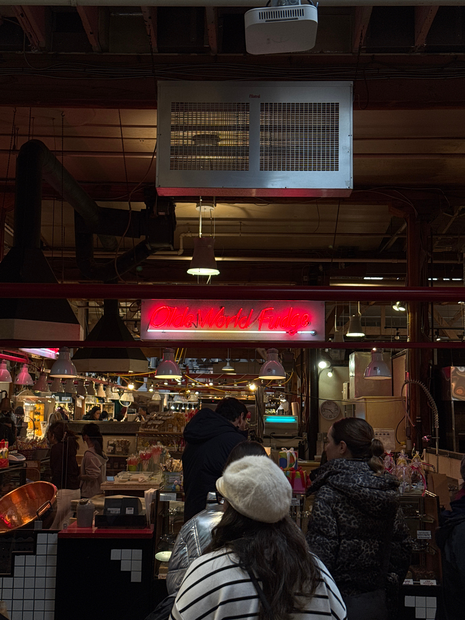 The image captures the inside of "Olde World Fudge" in Vancouver, Canada. Two women are standing, seemingly browsing the confectionery offerings. One is wearing a leopard-print jacket, and the other i…read more