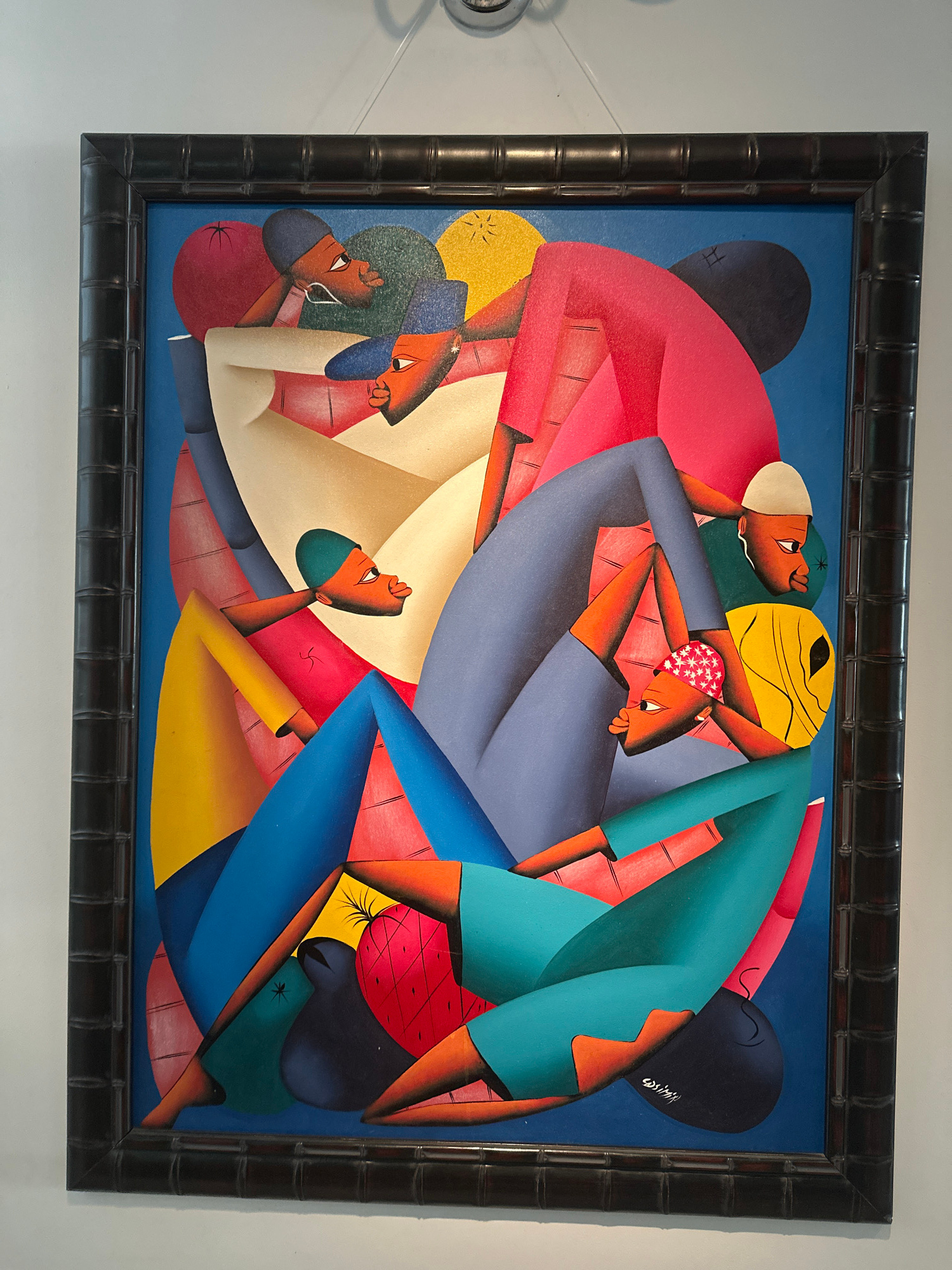 Framed artwork displaying an abstract style painting with various figures in shades of red, blue, yellow, and green. The figures are layered and intertwined against a blue background. The location is…read more