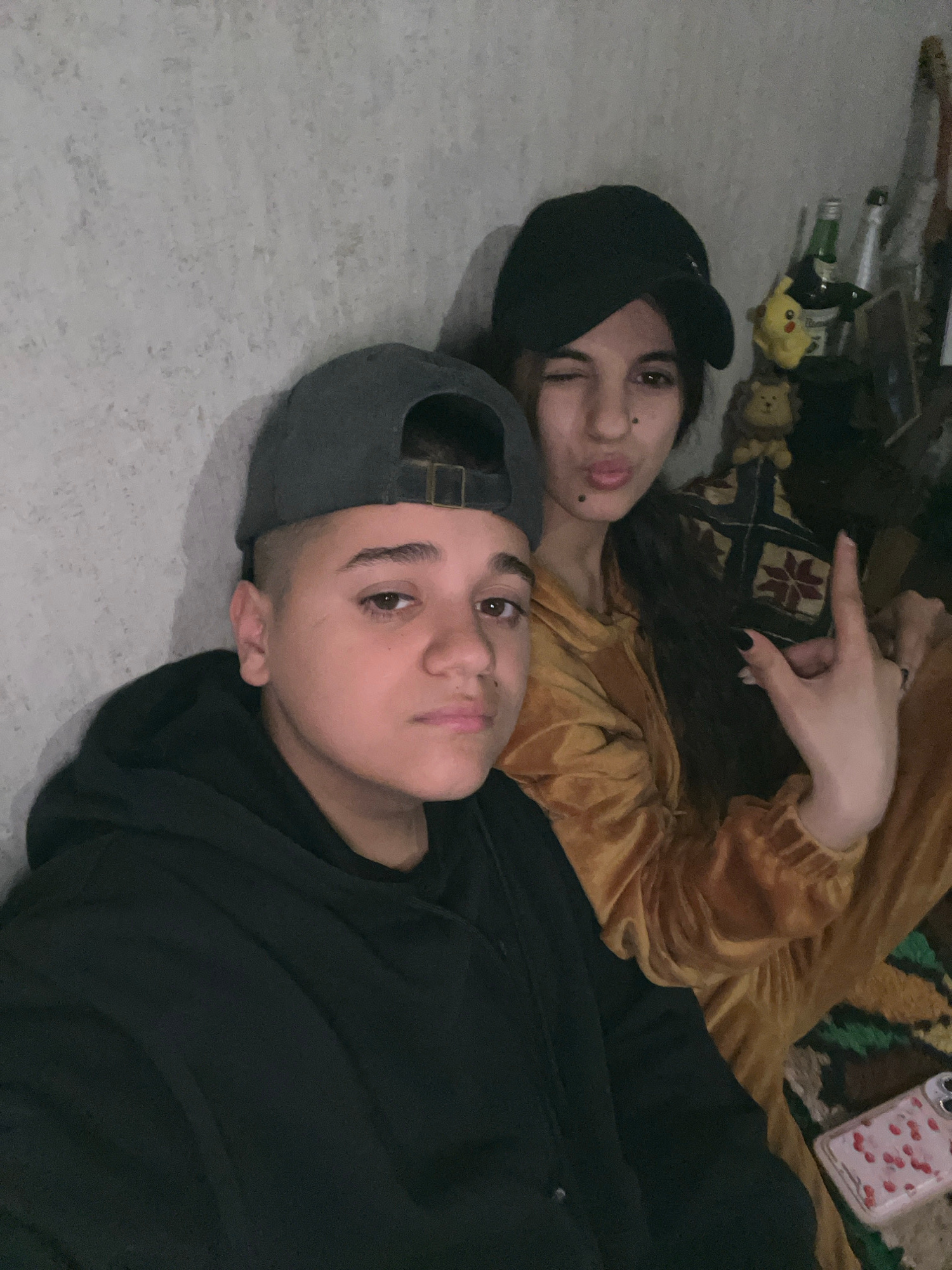 Two individuals are lying down, indoors. The person in the foreground is wearing a gray baseball cap and a black hooded sweatshirt. Behind them, the other person wears a black beanie, a mustard-colore…read more