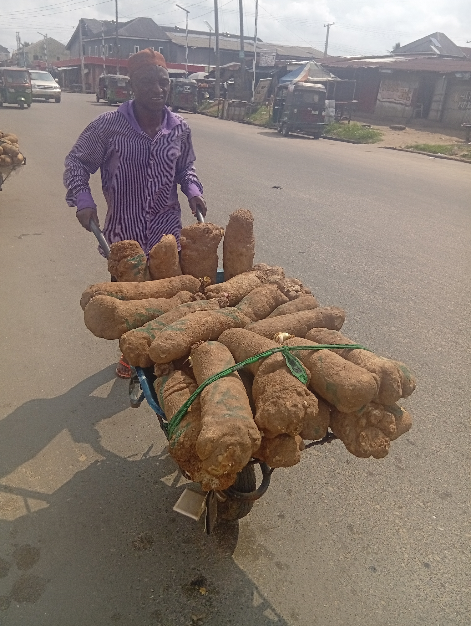 A man pushes a heavily laden two-wheeled handcart down an asphalt road in Aba, Nigeria, under a bright, hazy sky. He is positioned in the center-left of the frame, facing slightly right, wearing a pur…read more