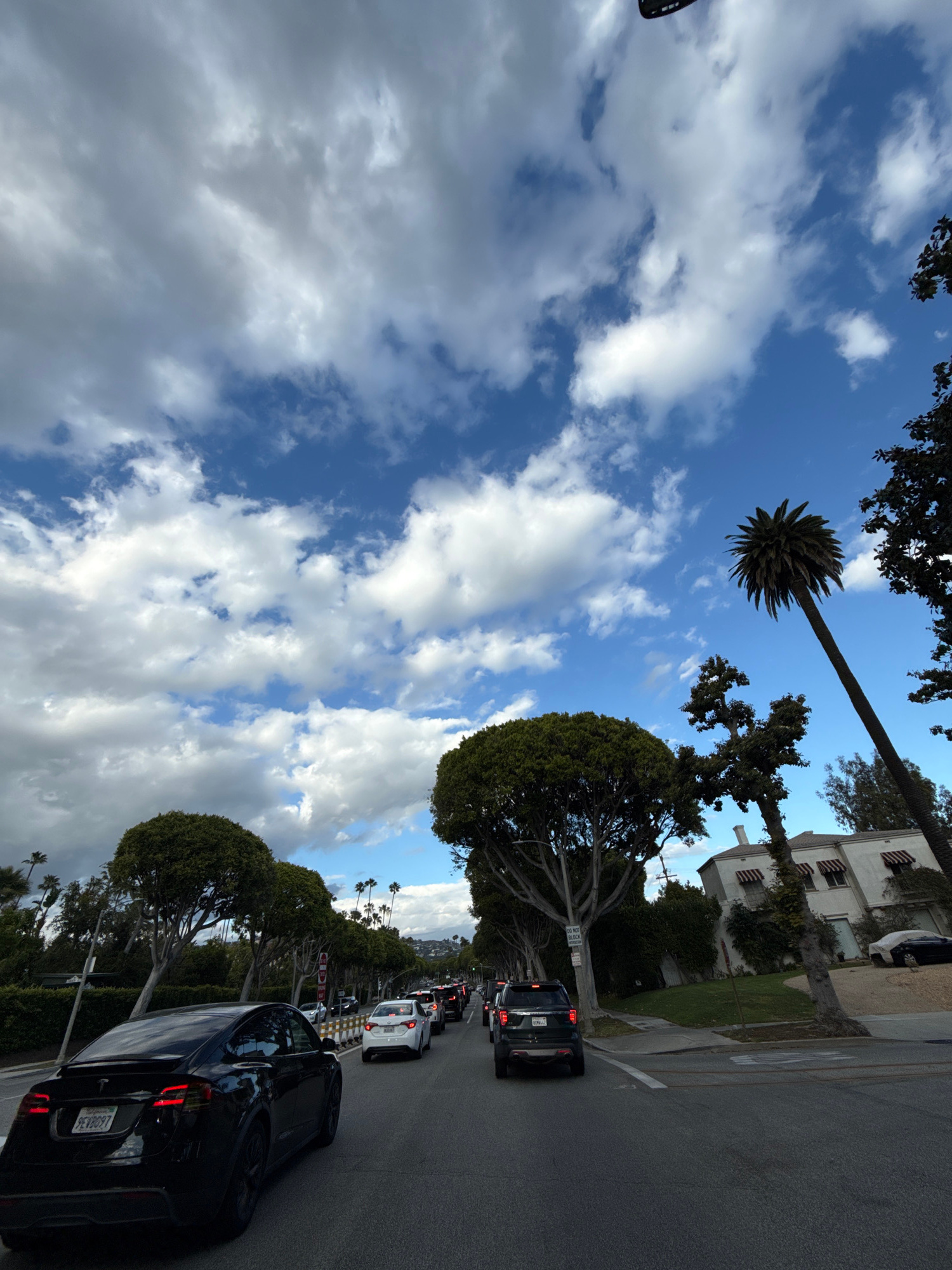 This image captures a street scene in Beverly Hills, California, United States. The view is oriented vertically, presenting a partially overcast sky dominated by white and gray clouds over a blue back…read more