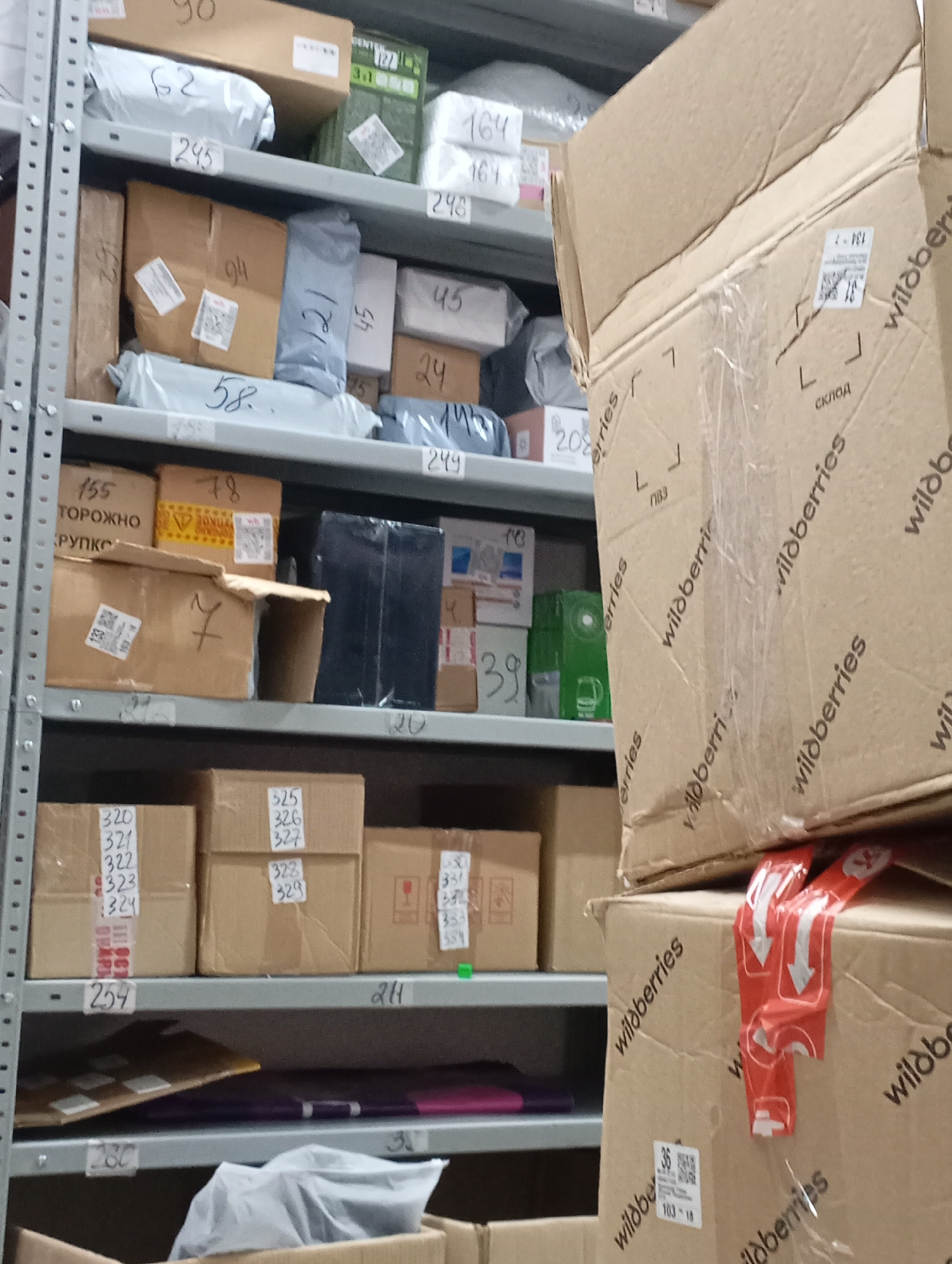 The image shows a warehouse or storage area, likely in Krasnodar, Russia based on the Wildberries branded boxes. Shelves are stacked with packages and boxes of various sizes and shapes, labeled with n…read more