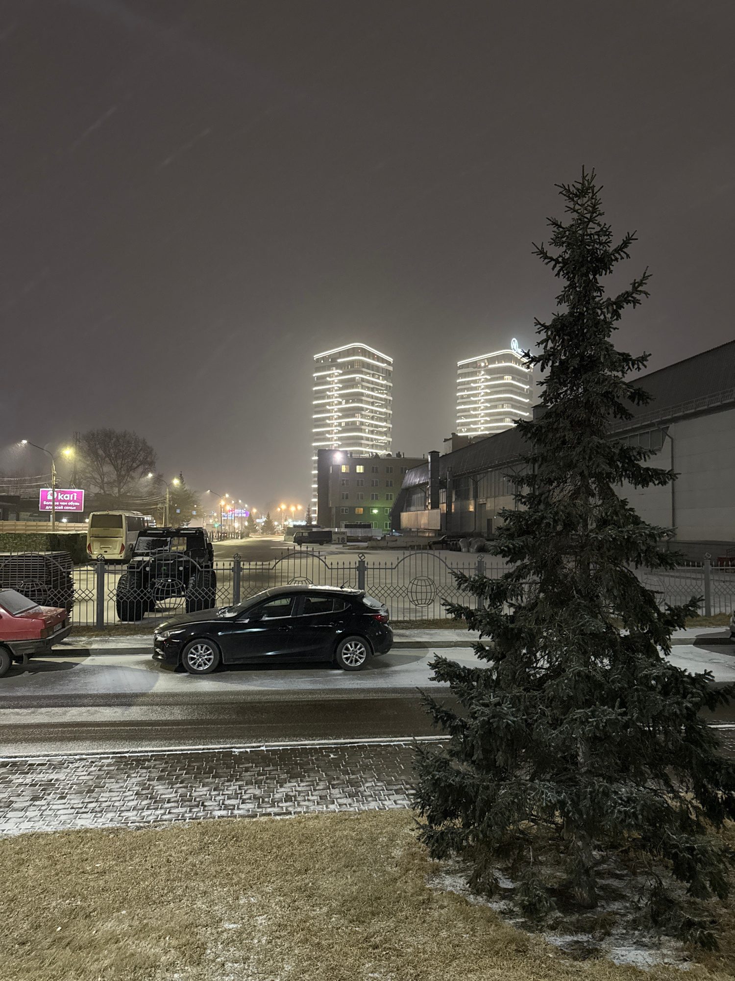 This is an exterior nighttime scene likely in the city of Krasnoyarsk, Russia, based on architectural style and signage. Two high-rise buildings in the background are illuminated with vertical rows of…read more