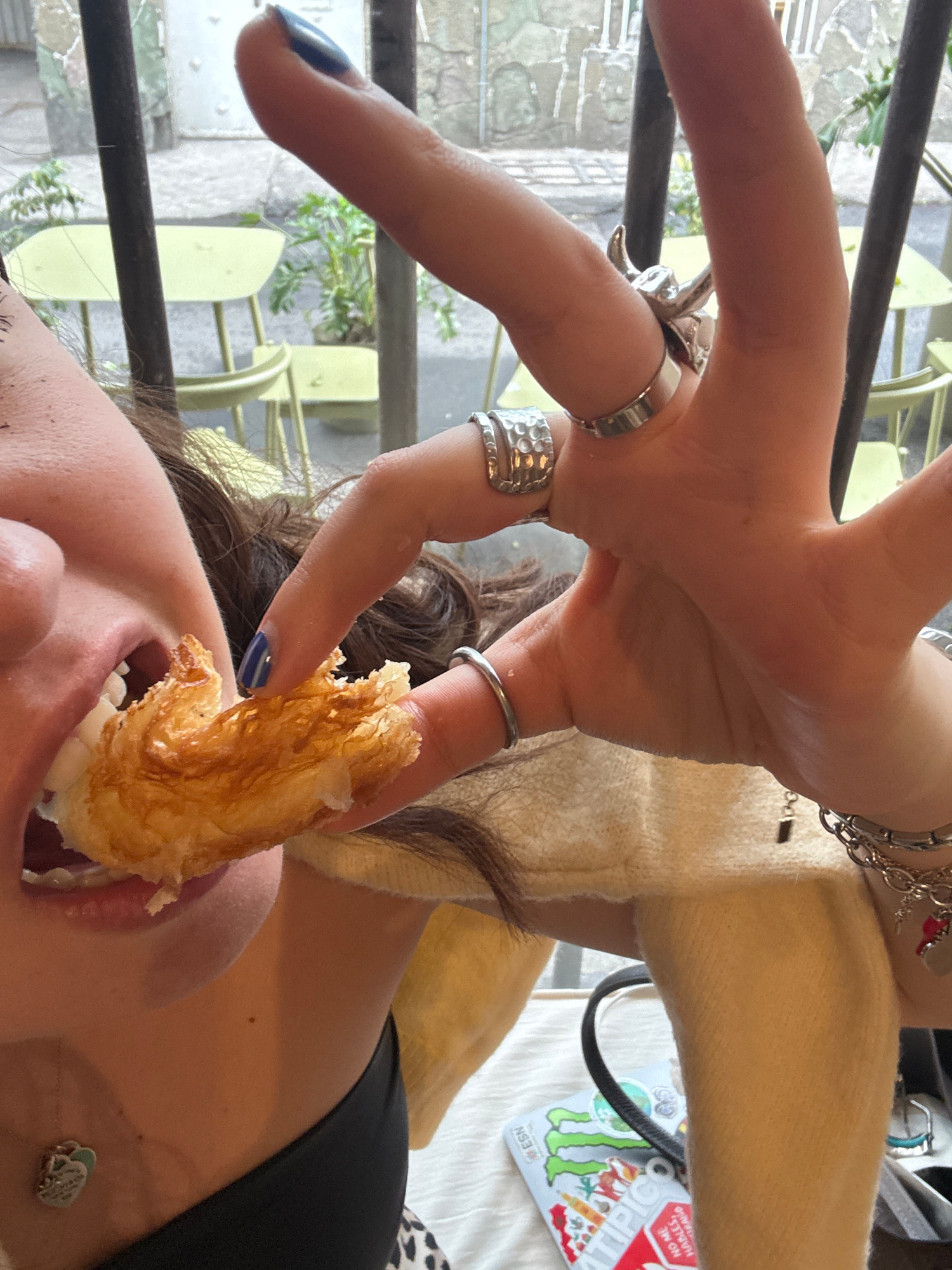 A person is holding a pastry to their mouth. The person has various rings on their fingers and painted nails. The location is possibly Mexico City, Mexico, based on an "epic" sticker.