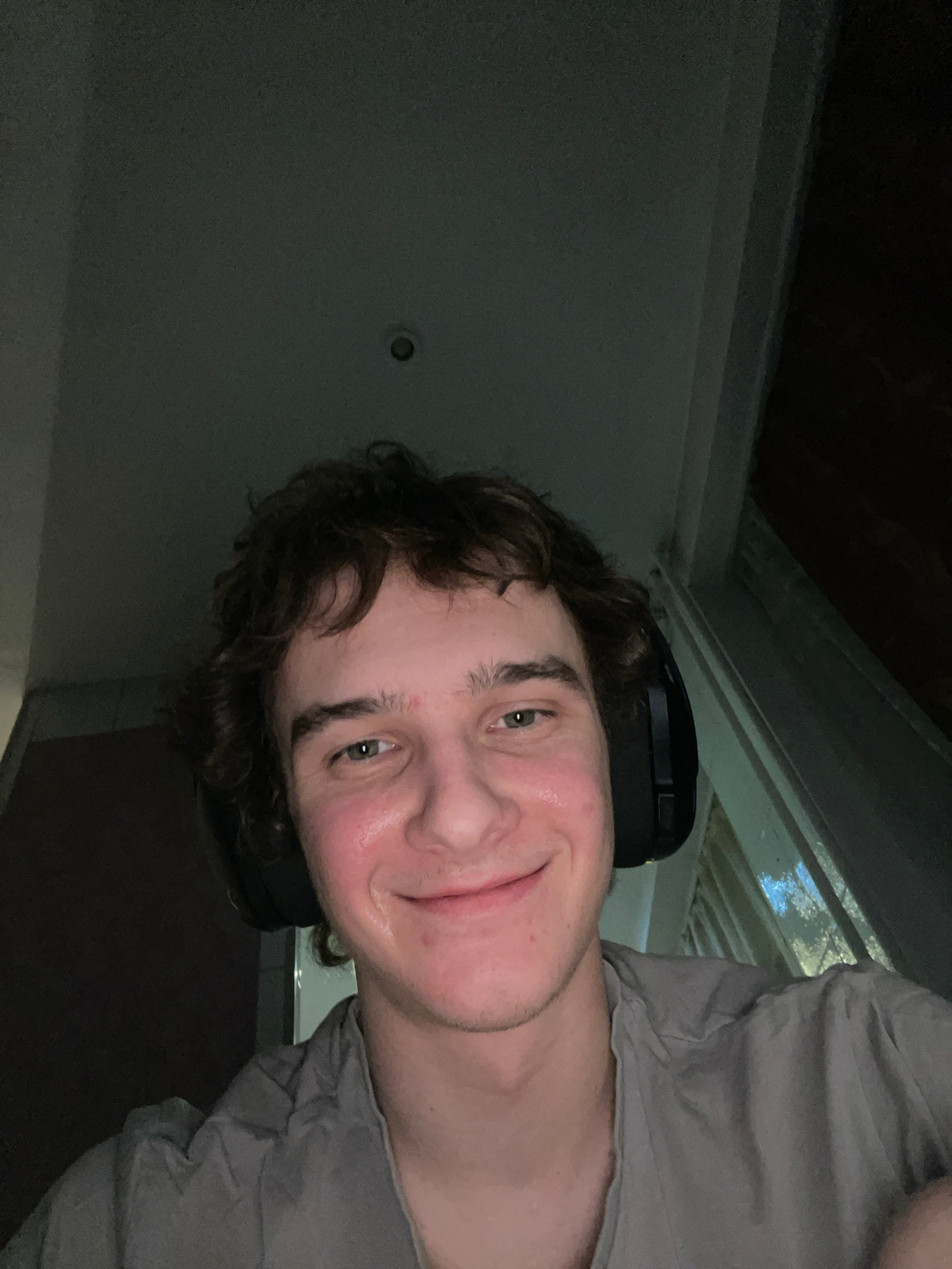 A selfie of a young Caucasian man with dark curly hair and a headset is illuminated by a light source above. The man is smiling with moist skin. He is wearing a gray t-shirt. The background shows a da…read more