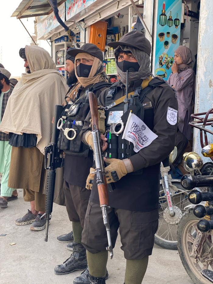 This image depicts an outdoor urban street scene in Kandahar, Afghanistan, likely a commercial district. In the foreground, two armed men stand on a paved surface, both wearing dark long-sleeved unifo…read more