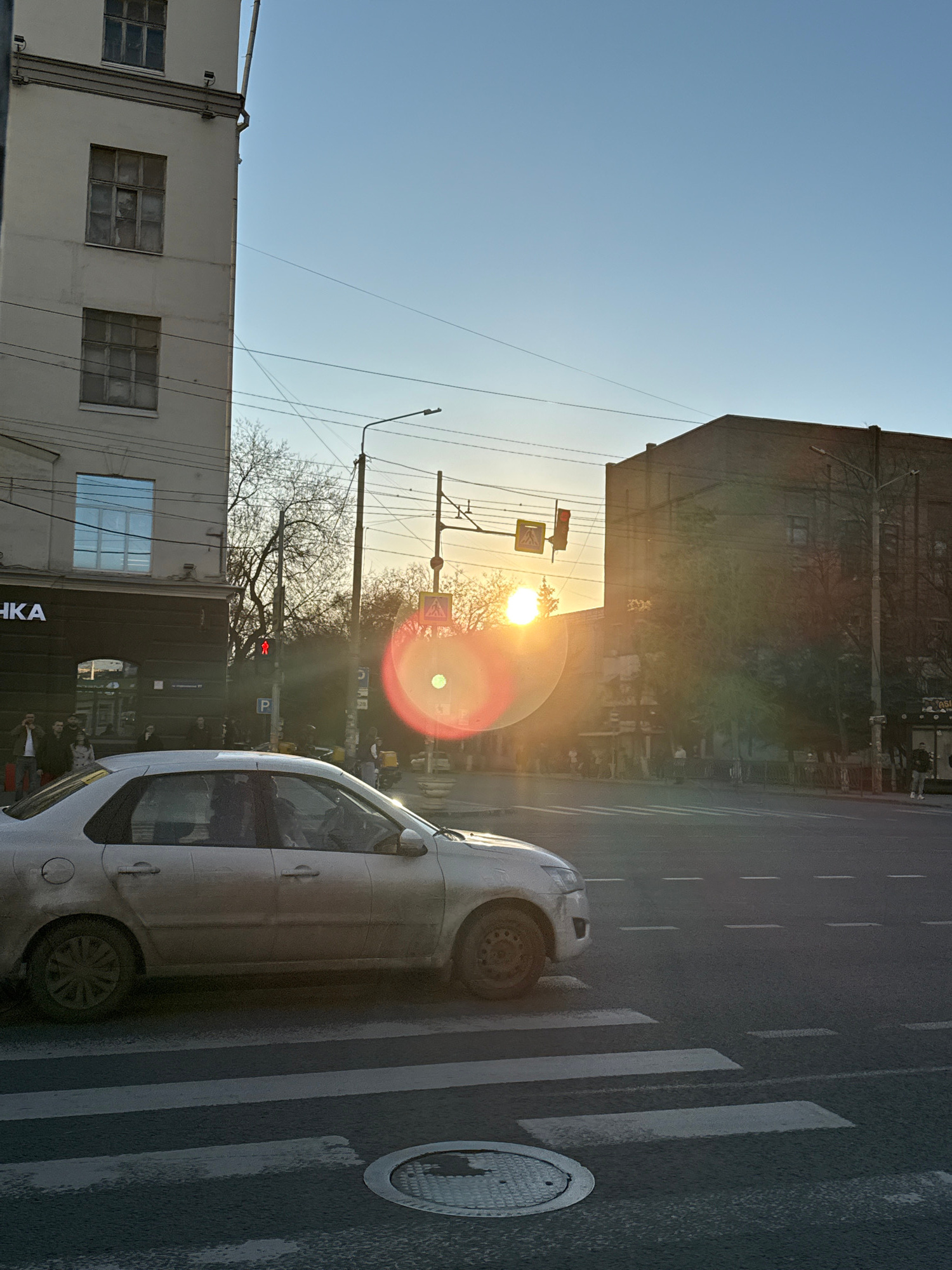 The image shows a street scene in Rostov-on-Don, Russia. A white car is parked on a pedestrian crossing. A manhole cover is visible on the right side of the road. Buildings are present on both sides o…read more