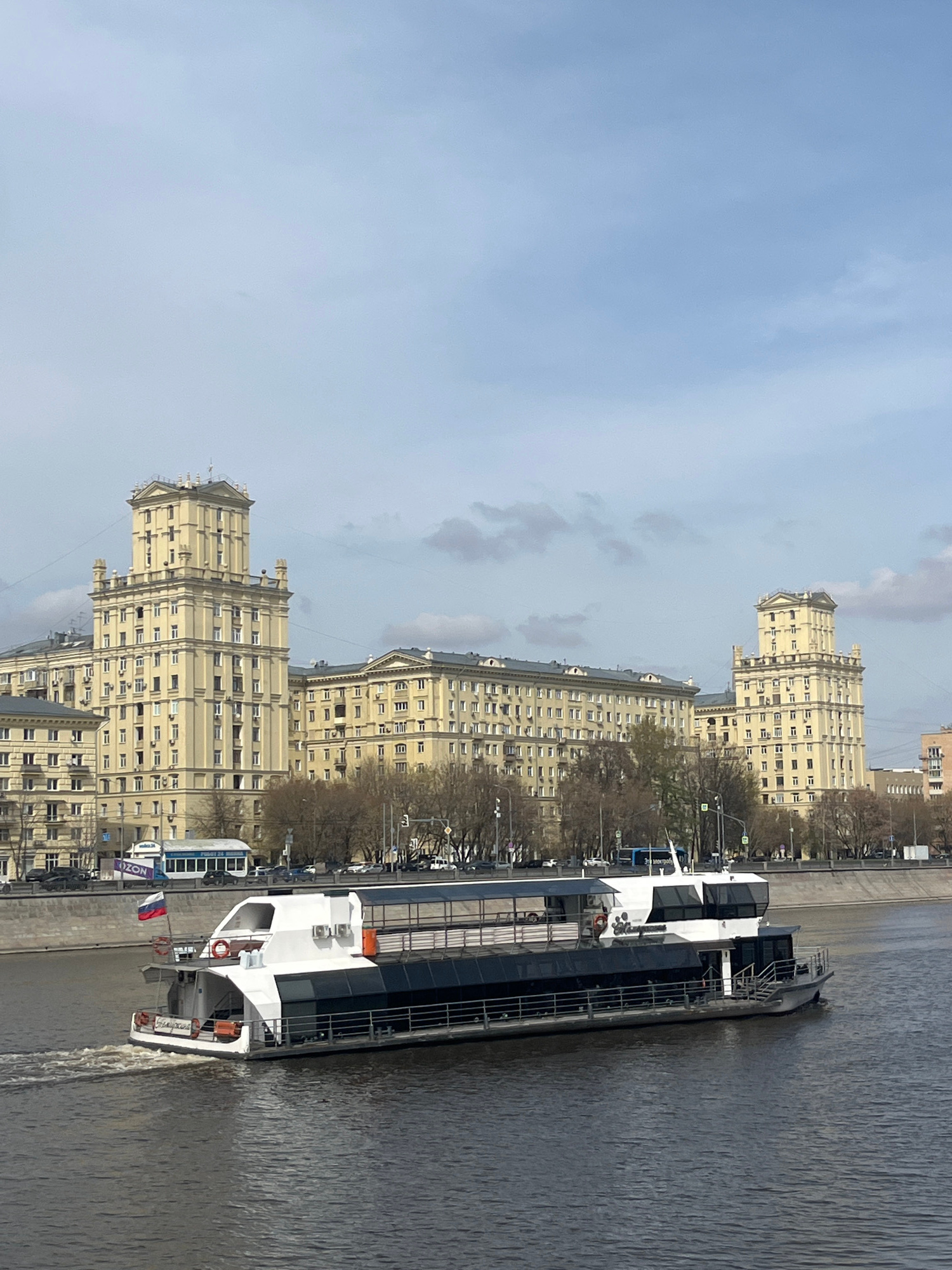 The image captures a daytime view of the Kotelnicheskaya Embankment Building in Moscow, Russia, situated alongside the Moskva River. A modern, multi-level riverboat is docked or moving along the river…read more