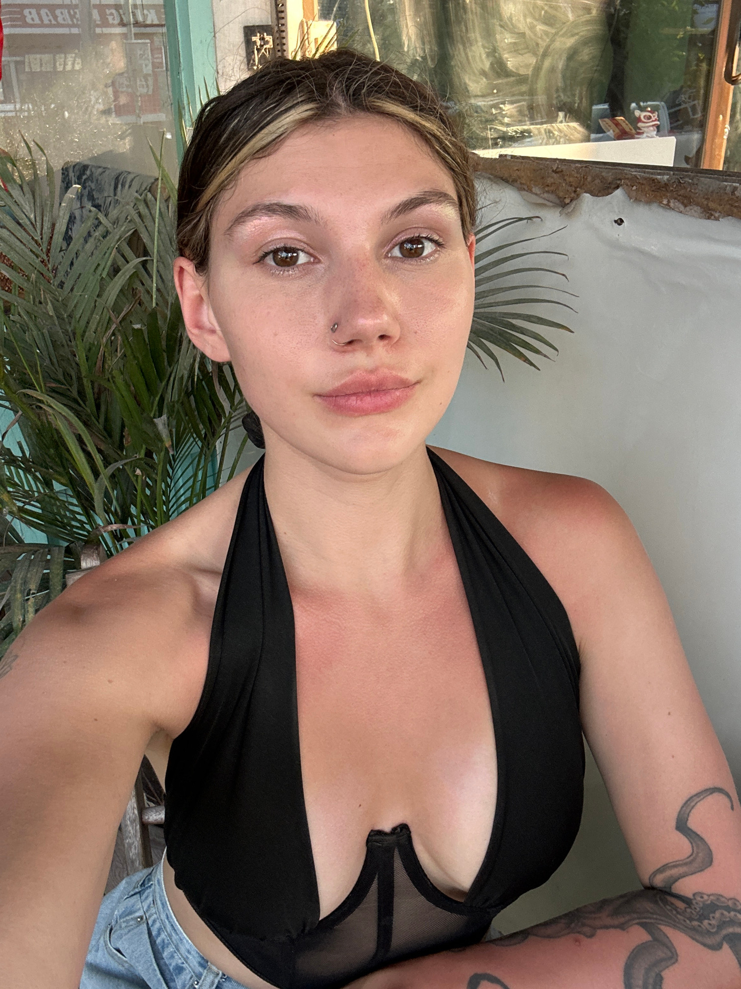A young woman with fair skin, light brown hair with blonde streaks, and a nose piercing is facing the camera. She is wearing a black top that reveals some of her chest and upper arms. Tattoos are visi…read more