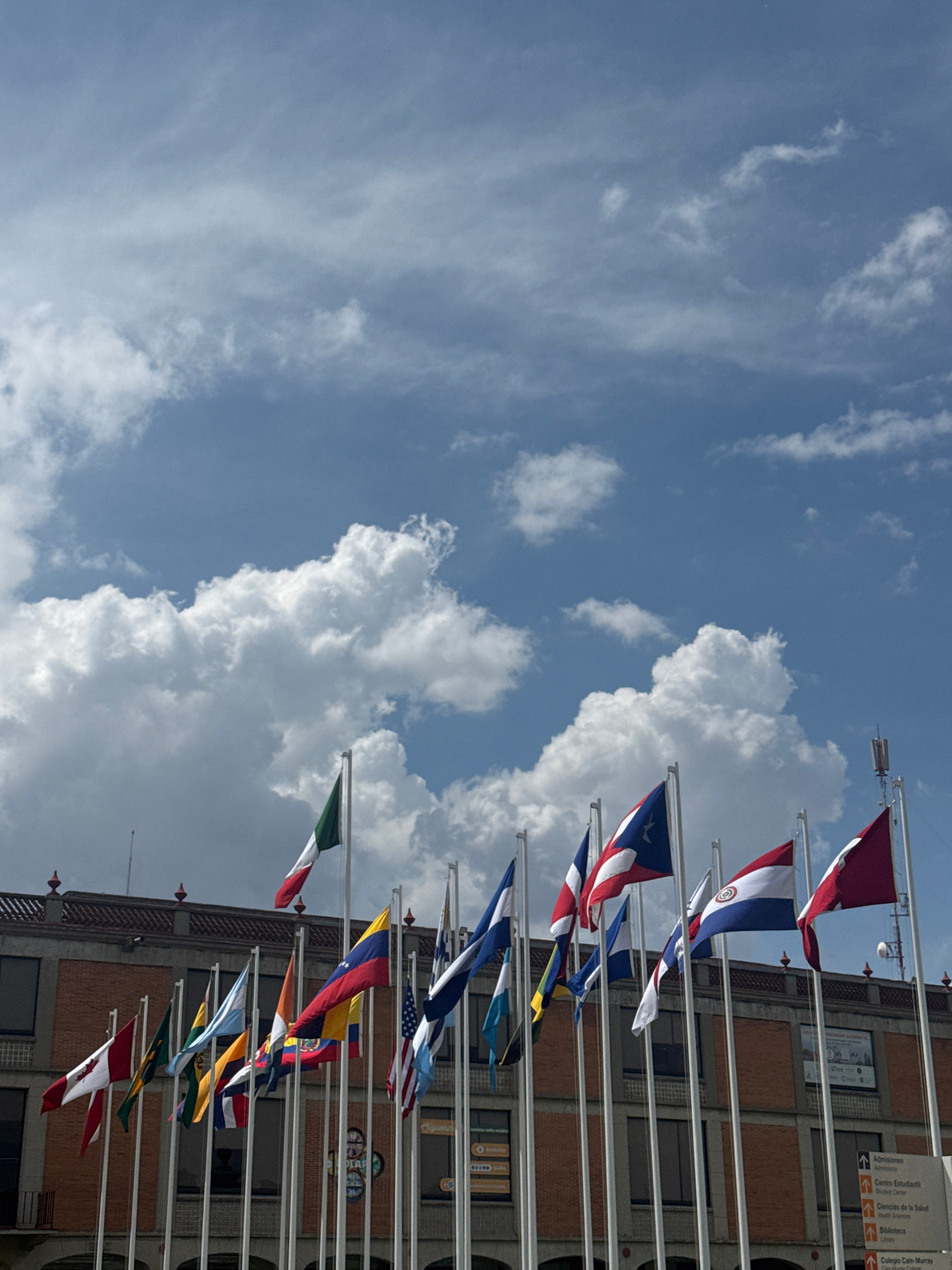 The image shows a view of the sky with white clouds and a building facade with flagpoles displaying various national flags. The building is a brick structure with concrete columns. There is a sign in…read more