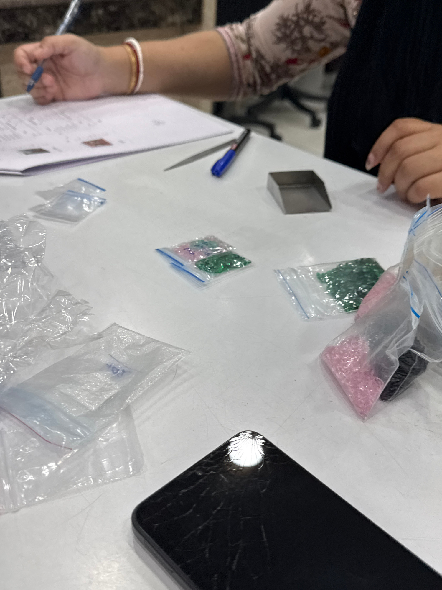 The image depicts a close-up view of a white tabletop in an indoor setting, likely a workshop or office, located in Kolkata, India. A person's right arm is visible in the upper left, actively writing…read more