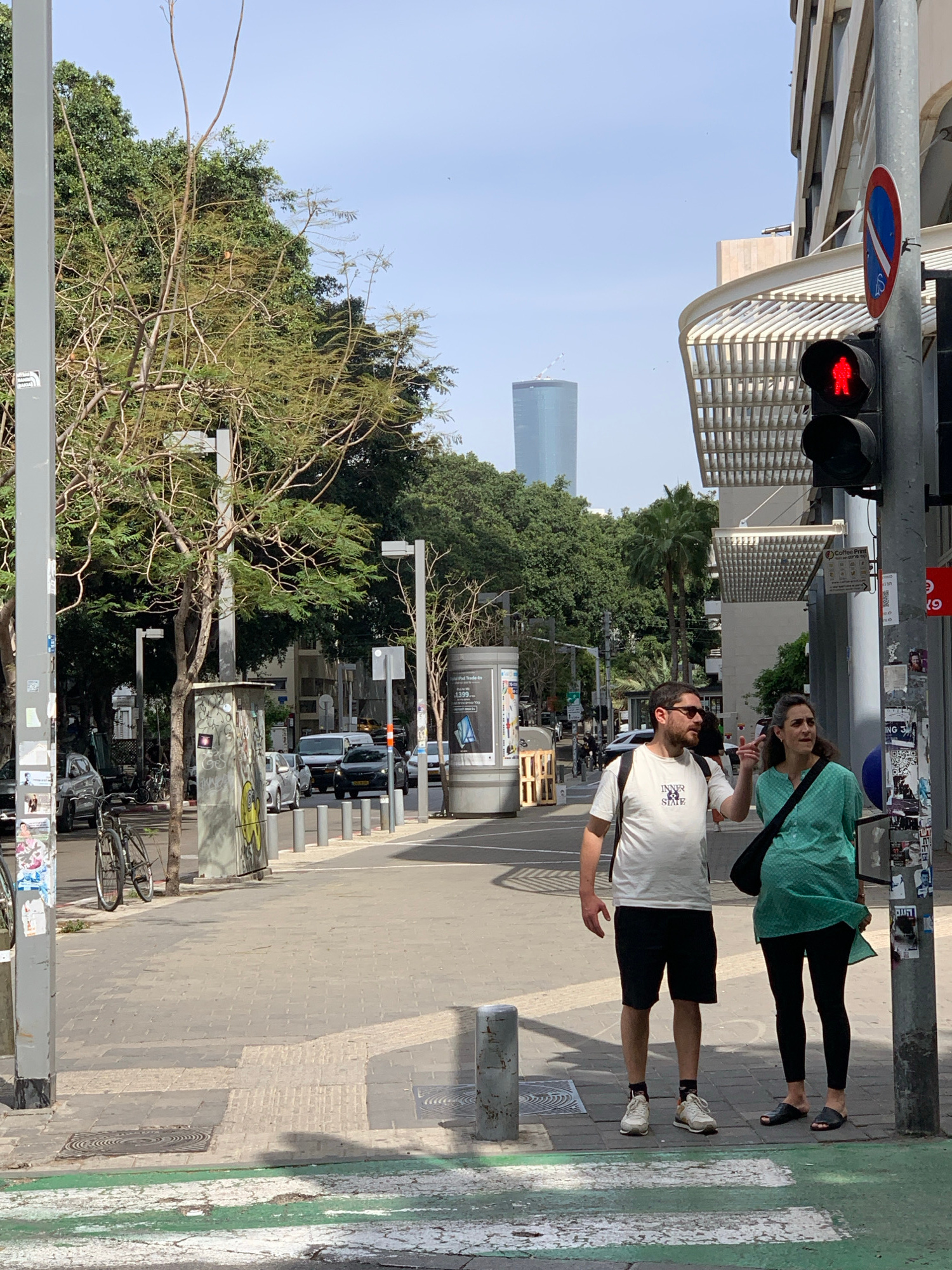 The image captures a street scene in Tel Aviv, Israel. Two pedestrians, a man and a woman, stand on a sidewalk near a pedestrian crossing marked with green stripes. The man wears a white t-shirt, blacβ¦read more