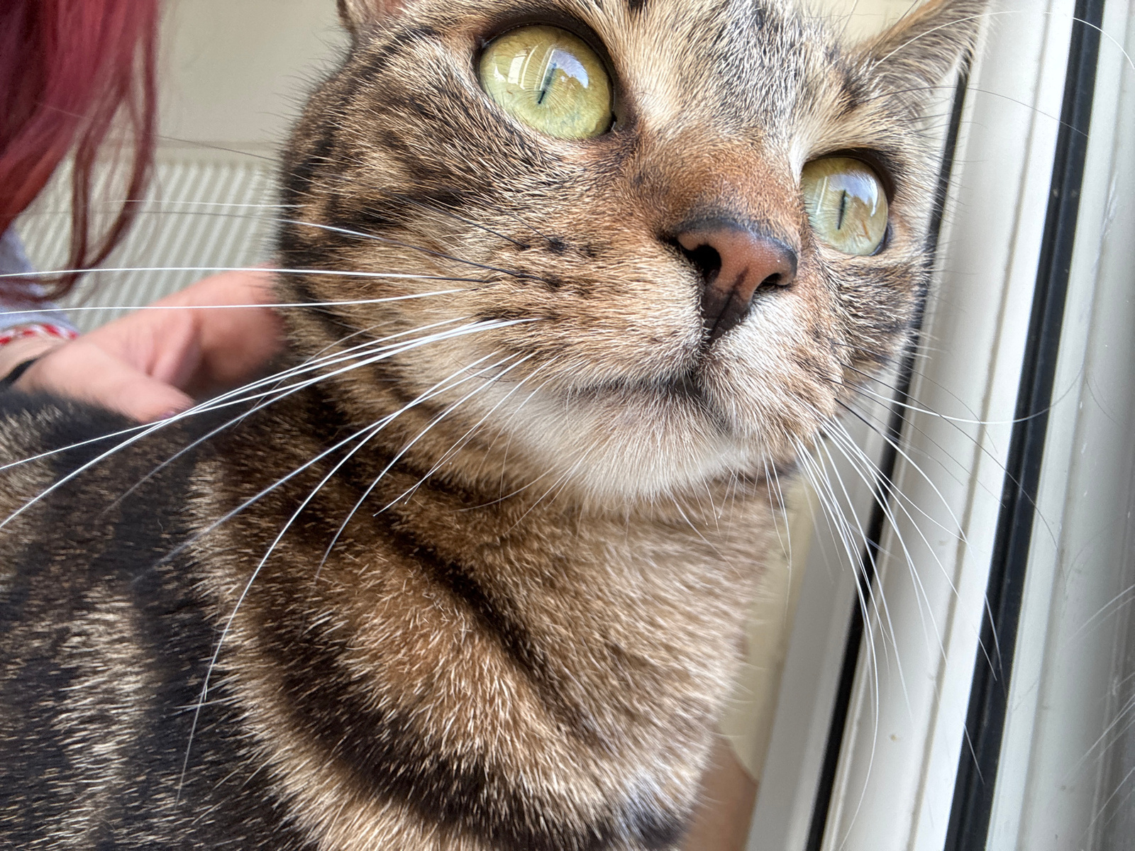 A close-up, upside-down view of a tabby cat's face. The cat has brown and black striped fur on its head and back. Its eyes are green with reflections of a window in them. The cat has long white whiske…read more