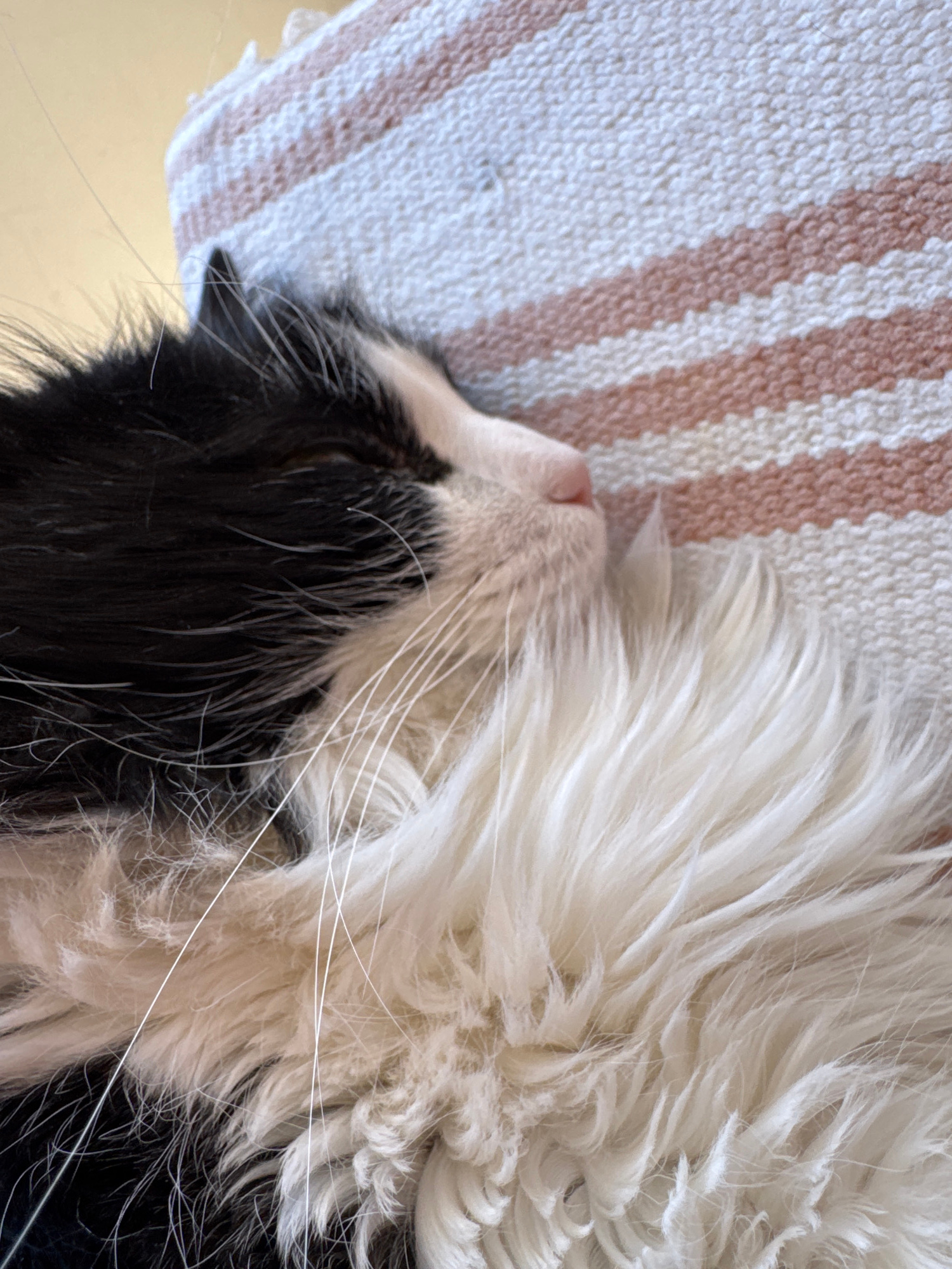 A close-up, angled, overhead shot captures a sleeping black and white cat on a striped towel. The cat's black fur is visible on the left side of the frame, transitioning into white fur that dominates…read more