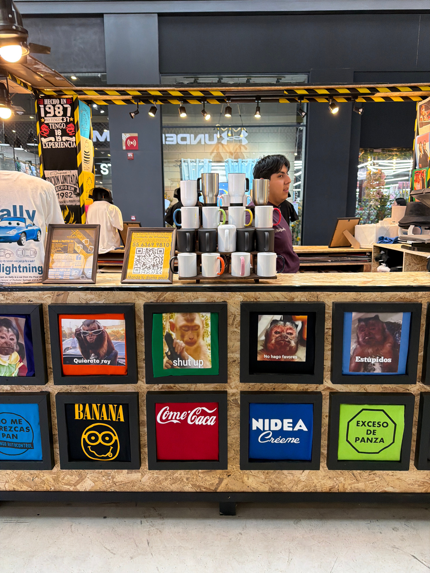 A retail display in a shop, possibly located in San Pedro Cholula, Mexico, showcases framed t-shirts with various designs. The shirts have quirky and humorous designs in Spanish. Mugs are stacked near…read more