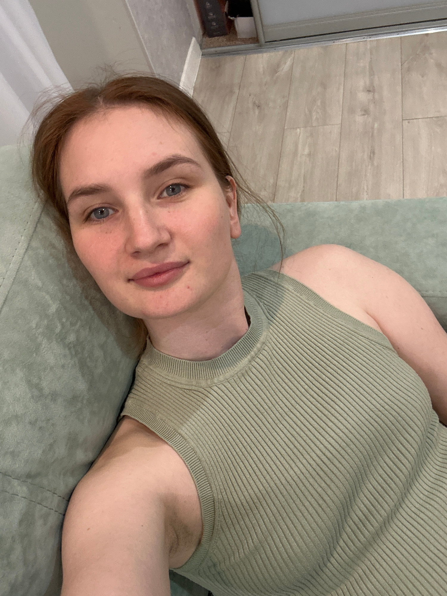 A young woman with fair skin, light brown hair, and blue eyes is the primary subject of this close-up, head-and-shoulders shot. She is lying down, positioned diagonally in the frame, and looking direc…read more