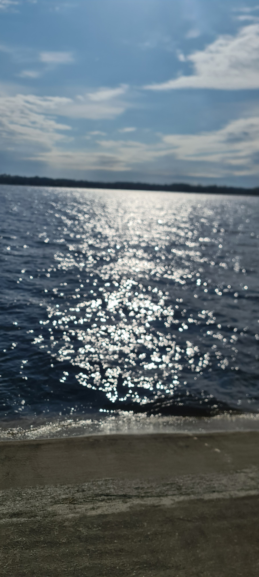 This image captures a vibrant waterscape scene, rotated 90 degrees clockwise. On the left, a bright blue sky is adorned with soft, white cumulus clouds, suggesting fair weather. The central and larges…read more