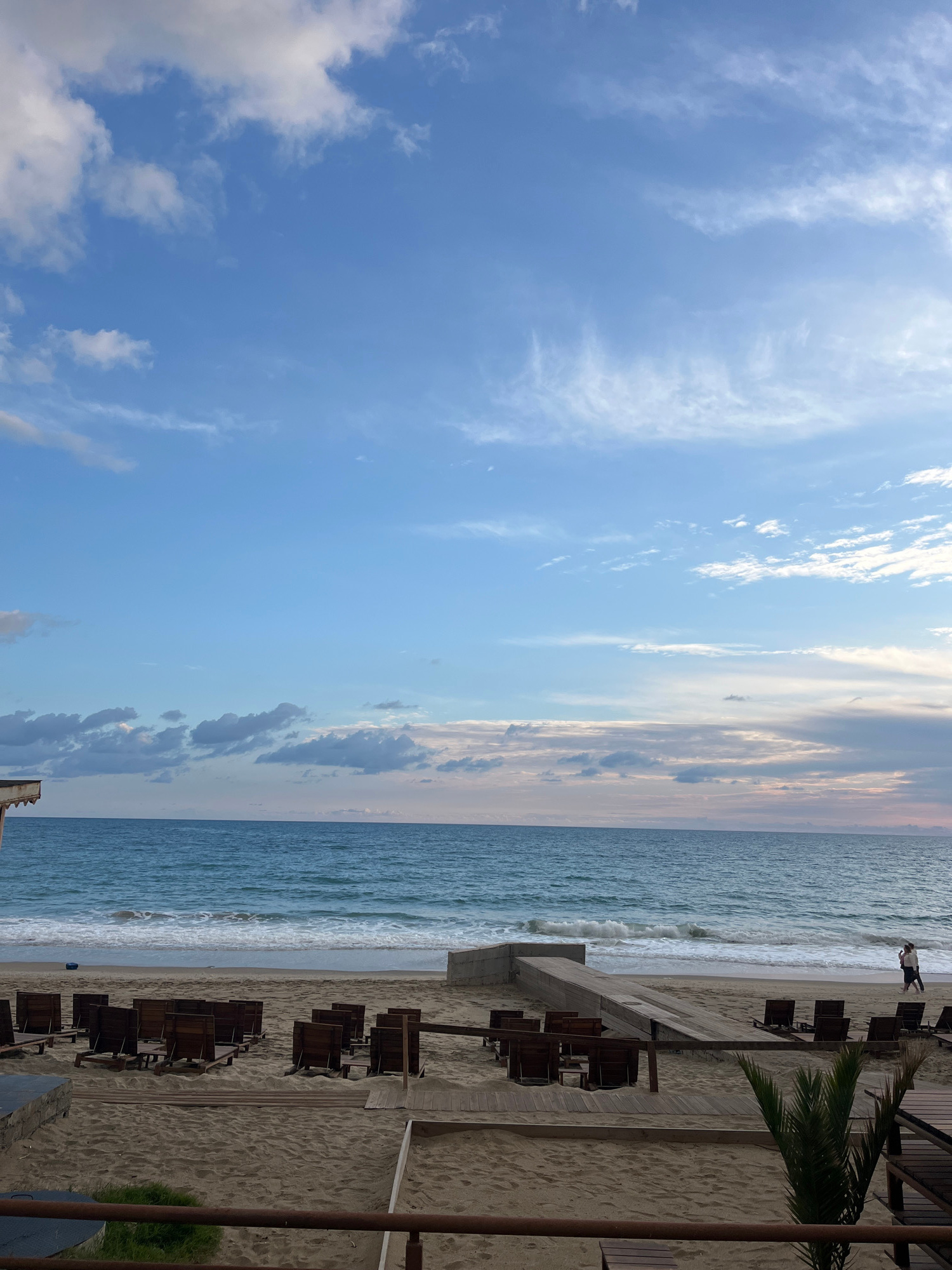 The image presents a beach scene, likely in Alanya, Turkey, given the typical beach infrastructure and environment. The sky occupies a substantial portion of the frame and shows a mix of light blue wi…read more