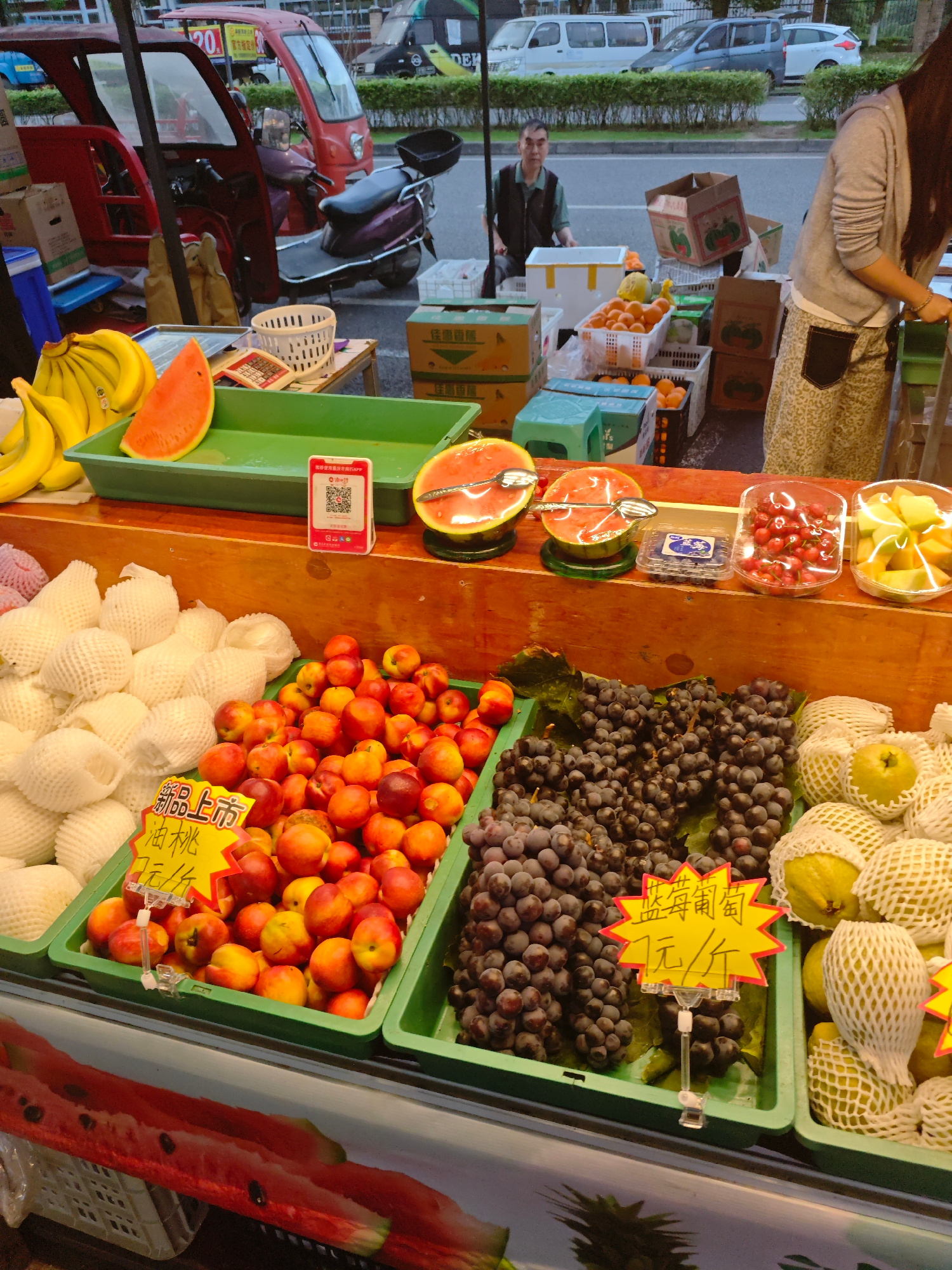 The image shows a fruit stand in Shapingba District, China. The stand is stocked with a variety of fruits including bananas, watermelon slices, peaches, grapes, and pears. Some of the fruit is package…read more